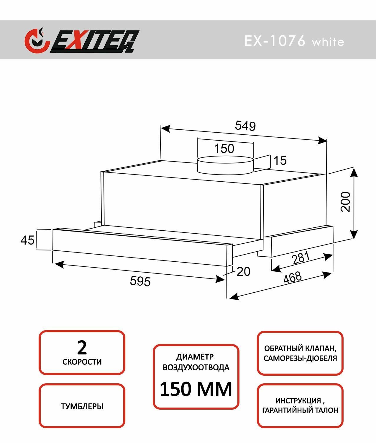 Вытяжка телескопическая EXITEQ EX-1076 white glass, 600 куб.м/час, ширина 59.5 см, белый, Китай информация: