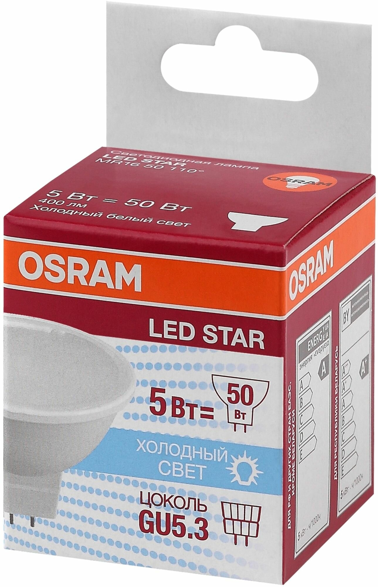 Лампа OSRAM LED Star GU5.3 MR16 12В 5Вт, светодиодная LED, 350 лм, эквивалент 35Вт, тёплый свет 3000К, прозрачная