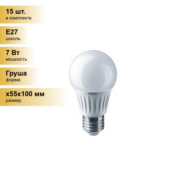 10 цен на (15 шт.) Светодиодная лампочка Navigator ЛОН A55 E27 7W(560lm) 4000 4K 110x60 NLL-A60-7-230-4K-E27 94386 . Цоколь E27