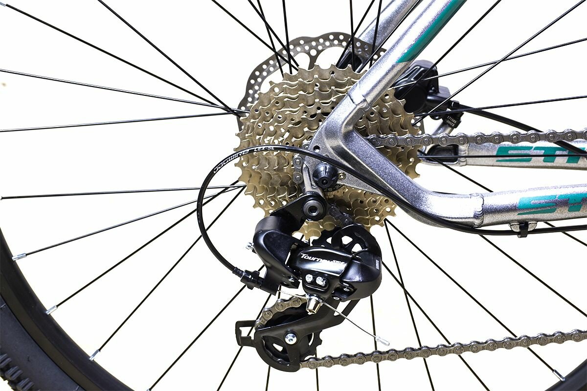 Велосипед взрослый горный Stark '24 Viva 27.2 HD, 8 скоростей, переключение ShimanoTourney, рама 18", колёса 27", (комфортный рост 165-180), серебристый металлик/мятный 57 990 ₽