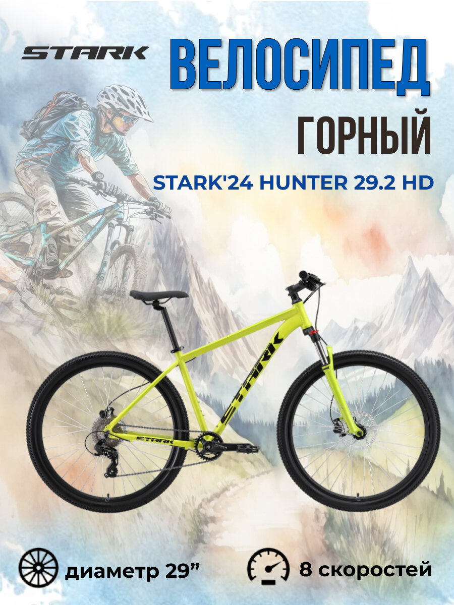 Велосипед взрослый горный Stark'24 Hunter 29.2 HD зелено-желтый черный рама 22" информация: