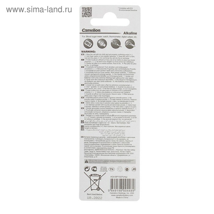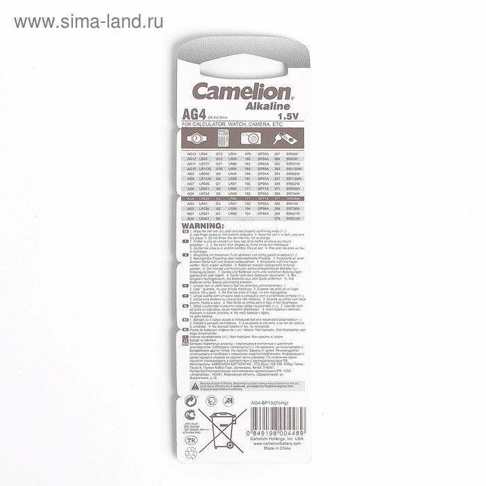 Батарейка алкалиновая Camelion Mercury Free, AG4 (377, LR626)-10BL, 1.5В, блистер, 10 шт. 2749865 информация: