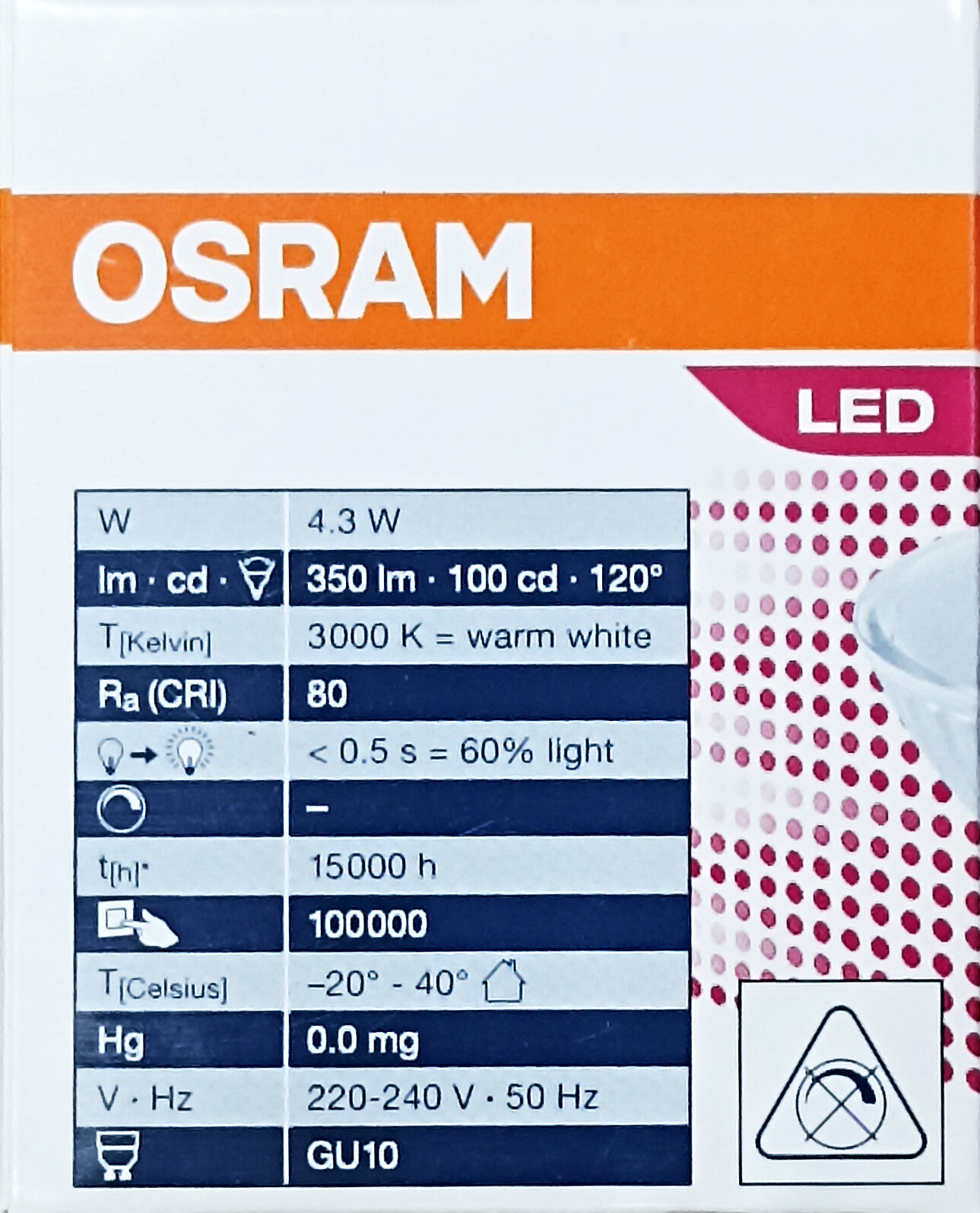 Отзывы на 10 шт/уп. Лампа LED Софит 4.3W 220-240V GU10 PAR16 350Лм 3000К Угол 120 град. D-50mm L-56mm Свет Теплый белый OSRAM, уп. 10шт