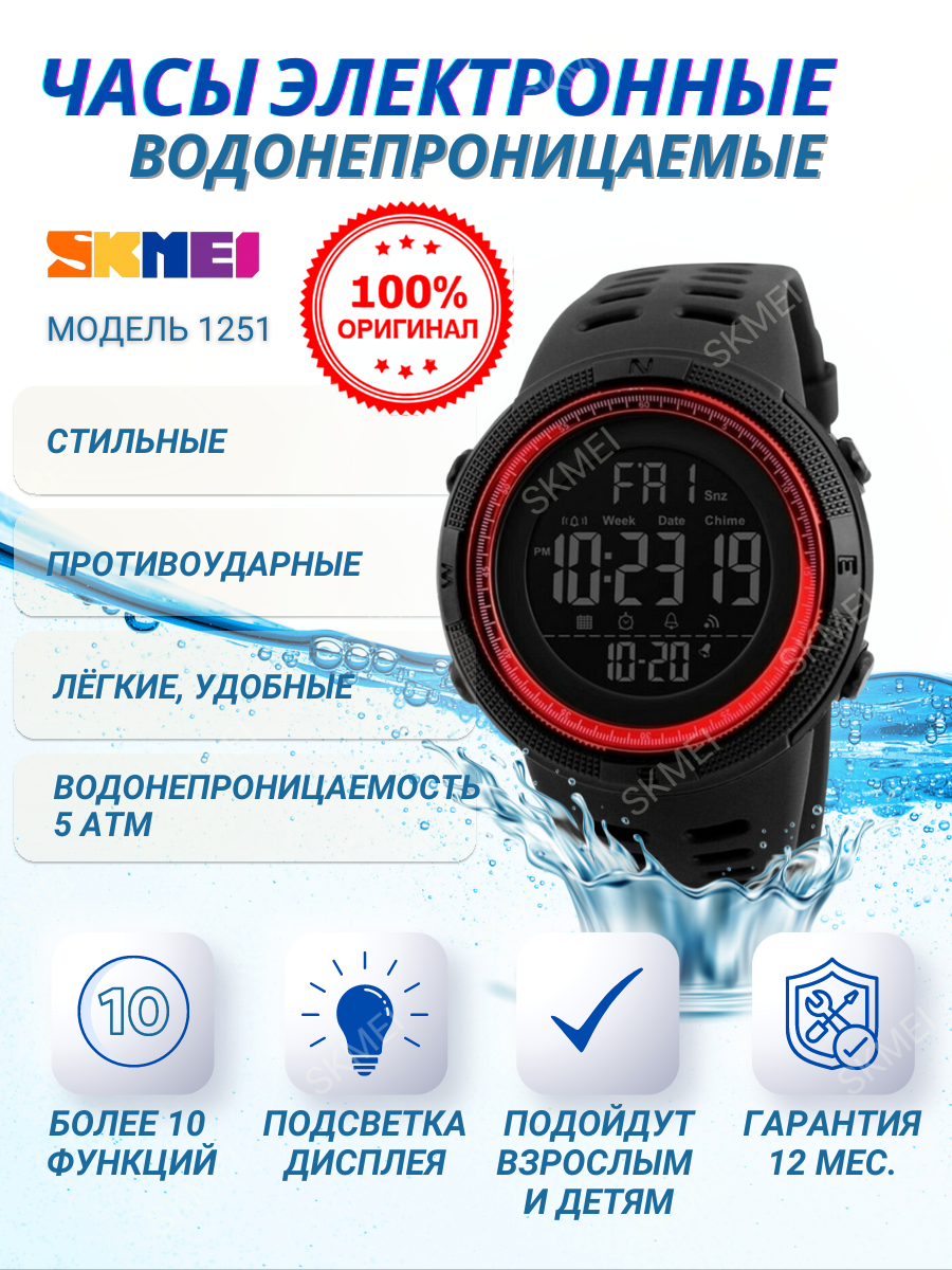 Часы наручные SKMEI 1251 черно-красные. Спортивные, водонепроницаемые, электронные, будильник, подсветка, таймер, секундомер