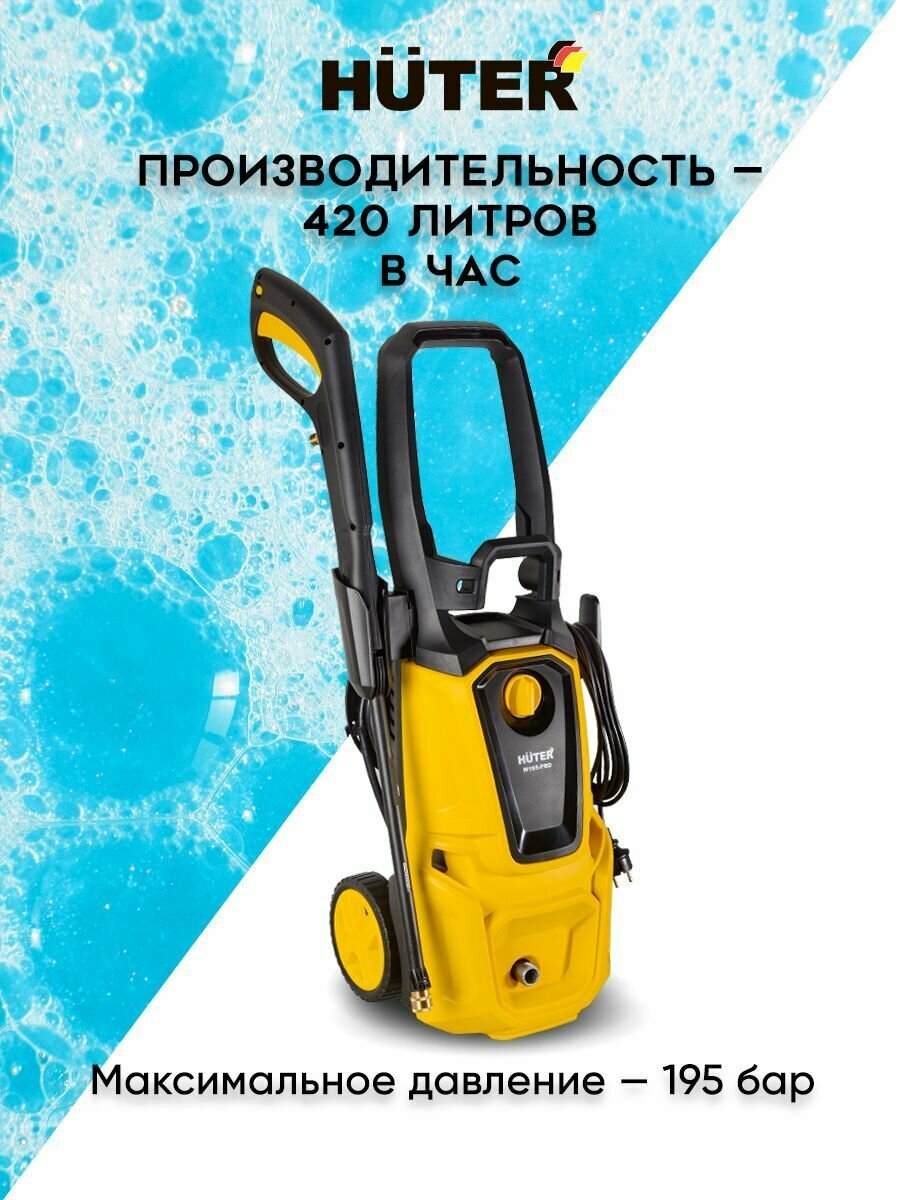 Мойка высокого давления Huter W195-PRO для автомобиля (2500 Вт, 195 Бар, 420 л/ч, шланг 8 м, барабан для шланга, проф. пеногенератор, подача воды: водопровод/емкость) Минимойка информация: