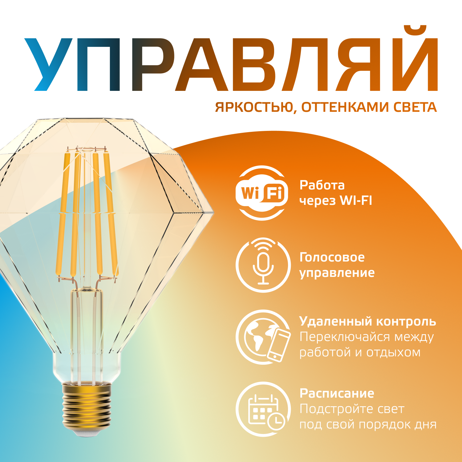 Умная Wi-Fi лампочка GaussSmartHome FilamentDiamond 7W740лм E27 управление голосом/смартфоном, с изменением температуры, диммируемая