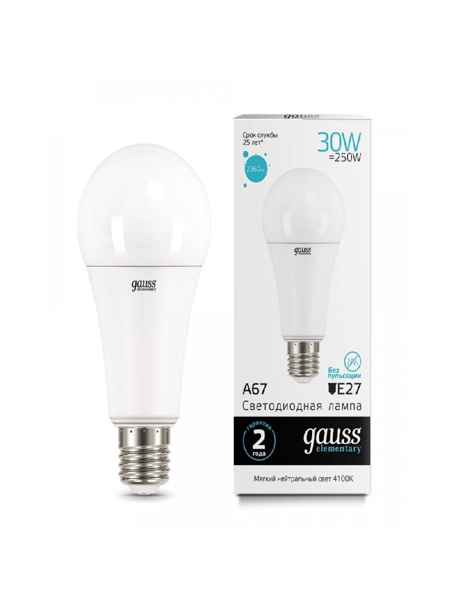 (2 шт.) Светодиодная лампочка Gauss Elementary ЛОН A67 E27 30W(2360lm) 4100K 4K 143x67 матовая, пластик/алюм. 73229 Нейтральный белый. Цоколь E27 информация: