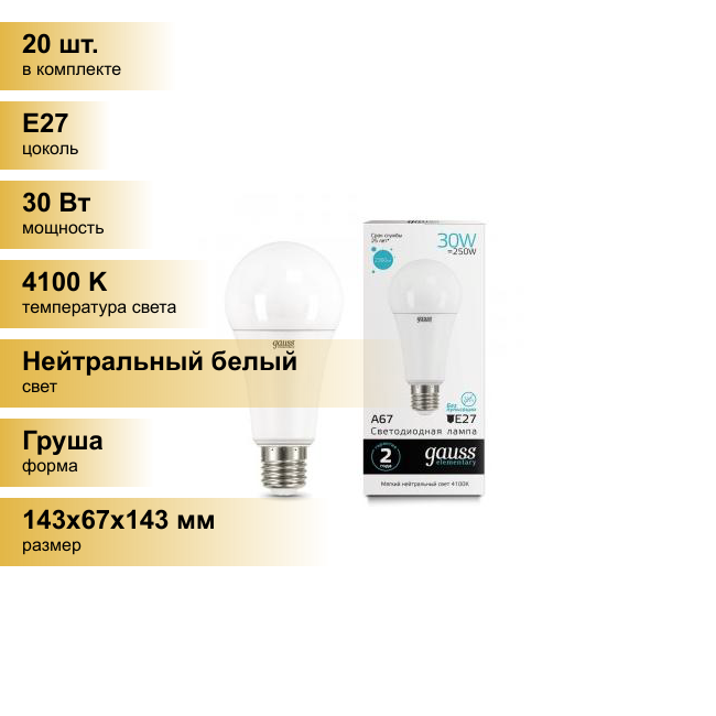 Отзывы на Лампа светодиодная LED 30 Вт 2360 Лм 4100К белая E27 А67 Elementary | код.73229 | GAUSS (20шт.в упак.)