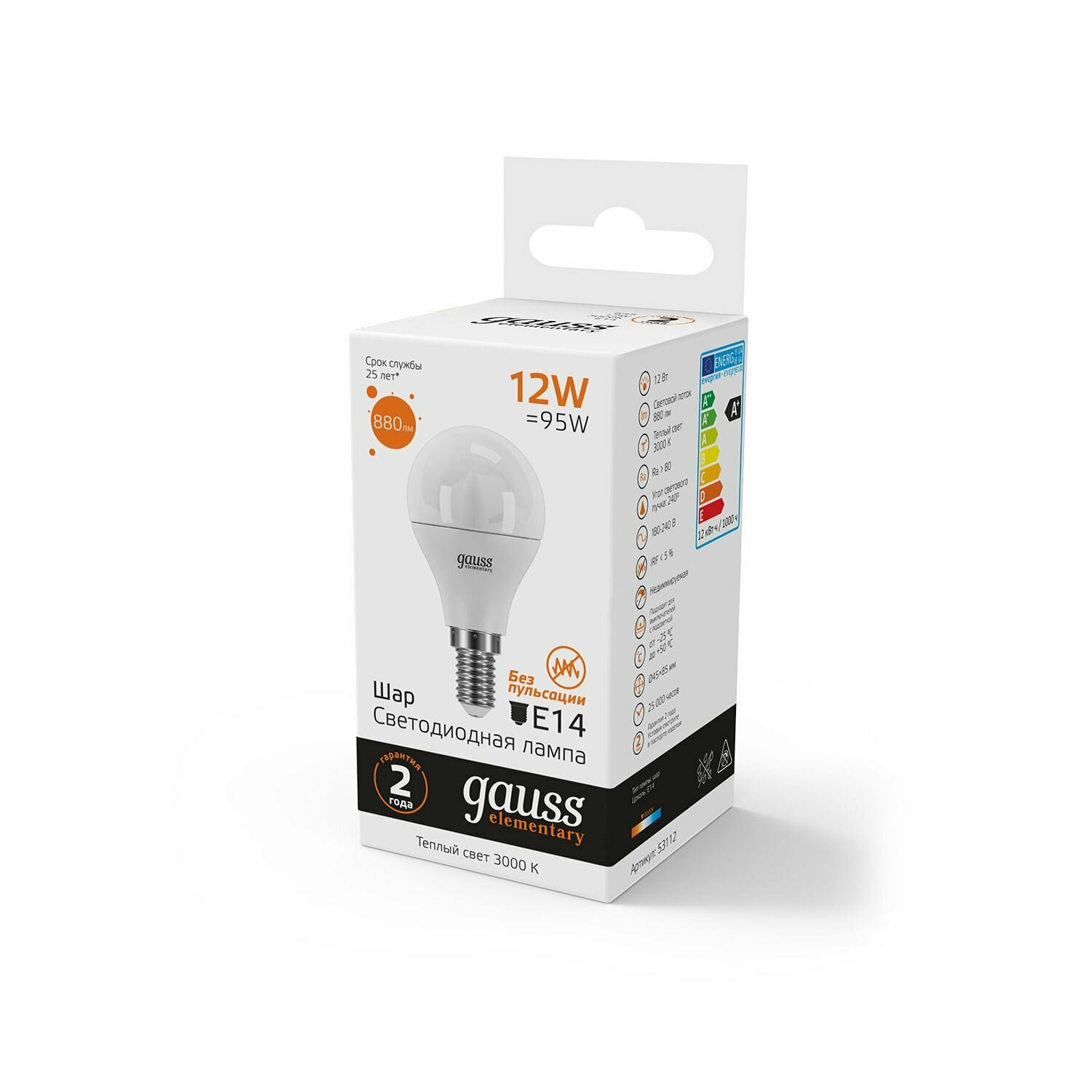 Лампа светодиодная Elementary 12Вт шар 3000К тепл. бел. E14 880лм GAUSS 53112