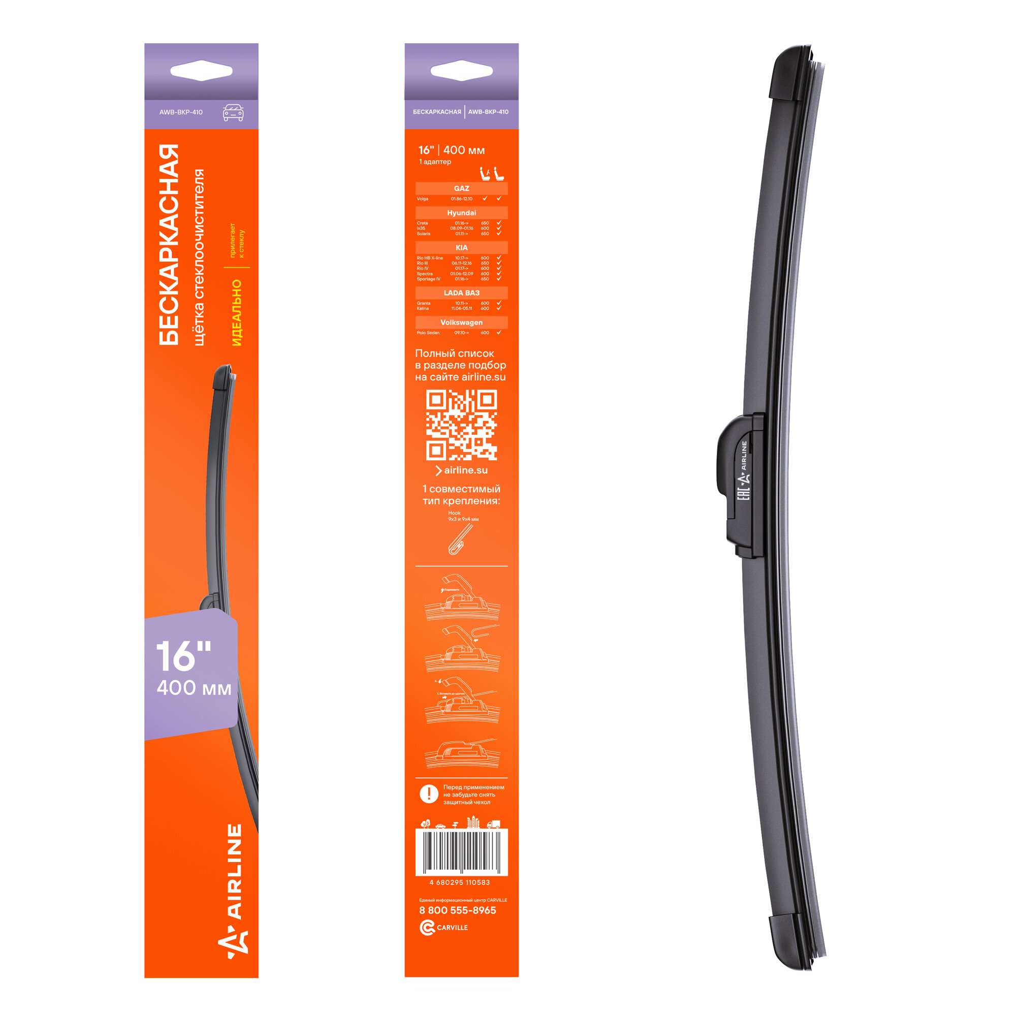 Щетка стеклоочистителя 400мм (16") бескаркасная, 1 адаптер (Hook 9x3, 9x4 mm - Крючок 9x3, 9x4 мм) AWB-BKP-410 AIRLINE информация: