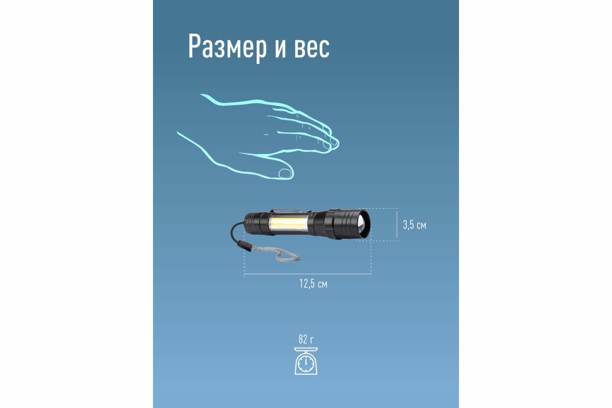 Фонарь аккумуляторный ручной LED 1Вт + COB 5Вт линза зум аккум. Li-ion 18650 1А.ч USB-шнур ABS-пластик космос KOS113Lit