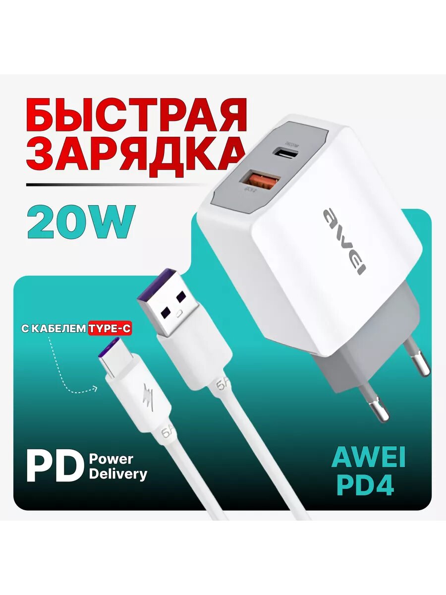 Сетевое зарядное устройство AWEI PD4 с кабелем Type-C информация: