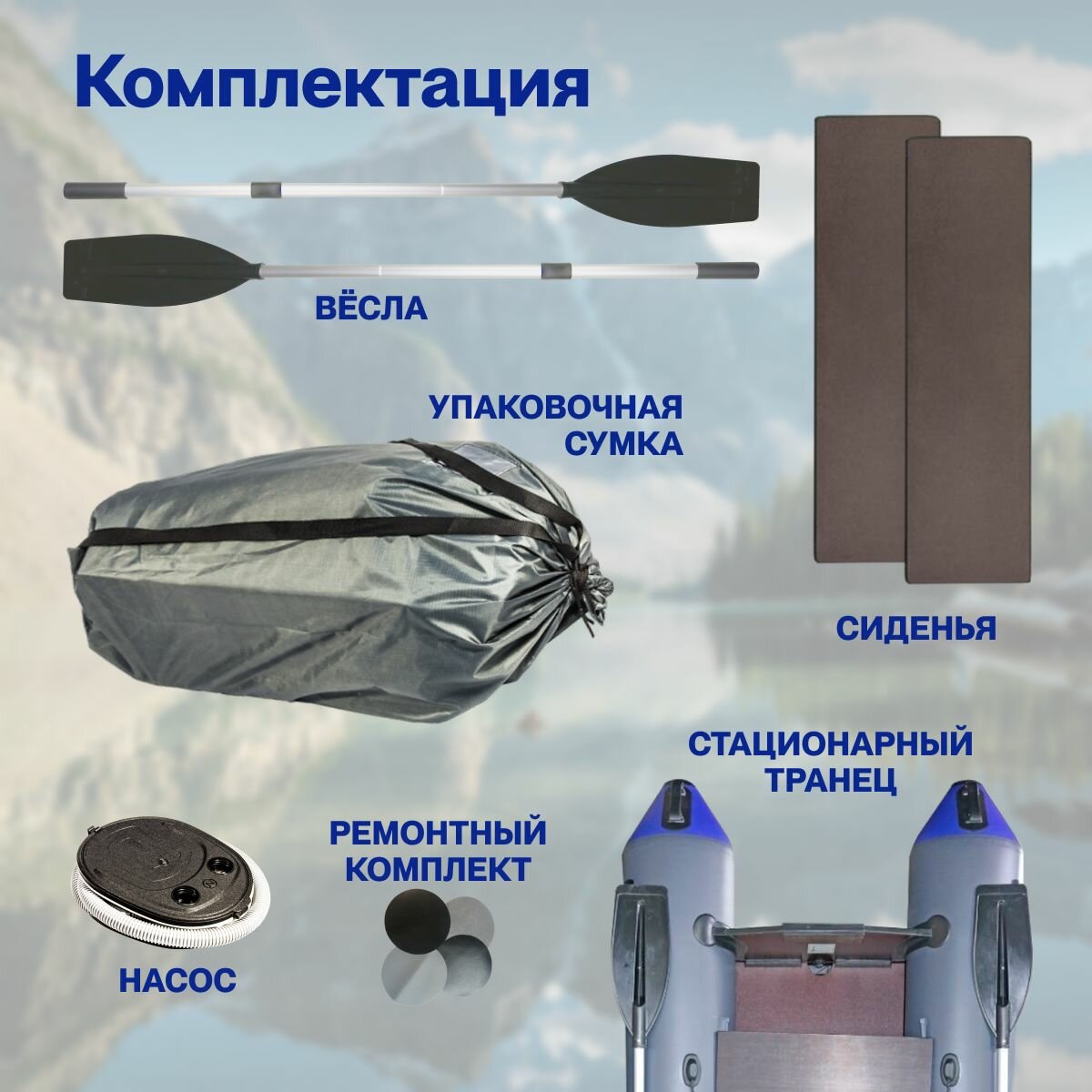 Лодка ПВХ надувная под мотор Муссон 3200 НД для рыбалки с надувным дном и веслами, серый/синий