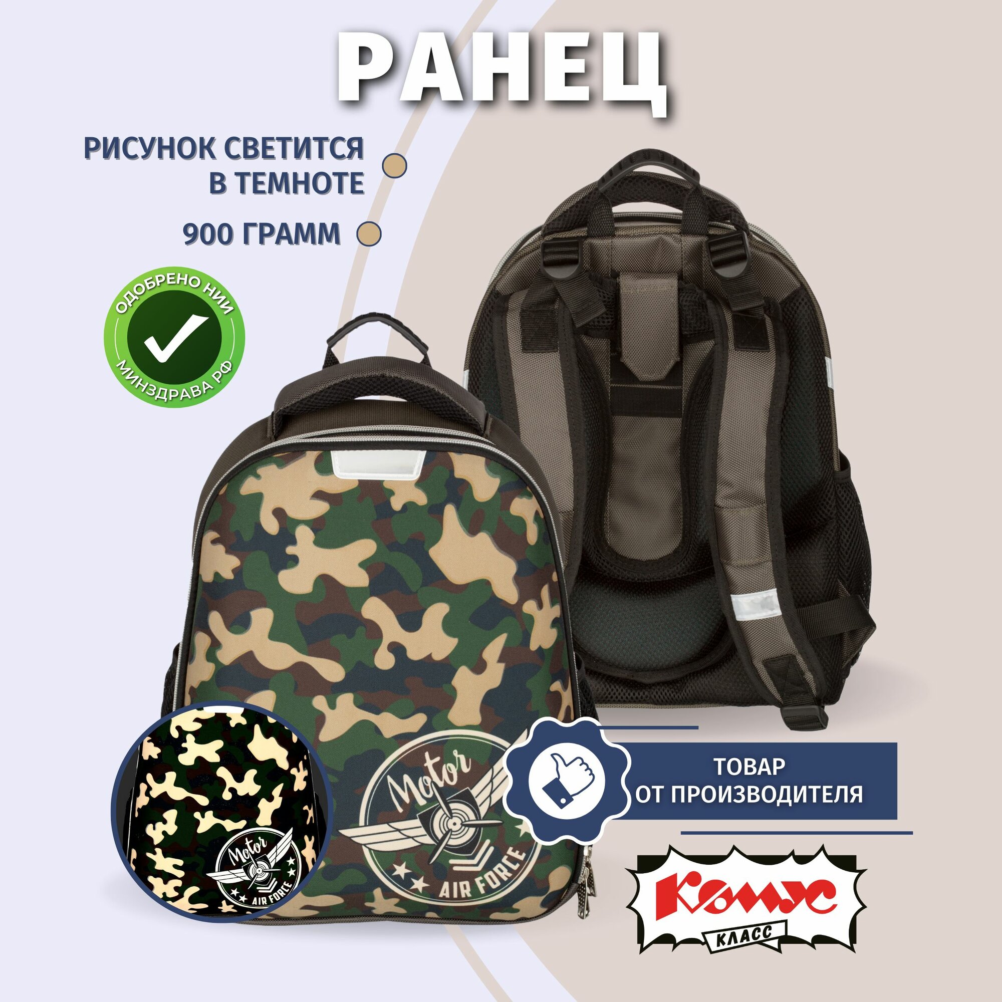 Ранец школьный Комус Класс Basic Military, анатомический, 2 отделения, 4 кармана информация: