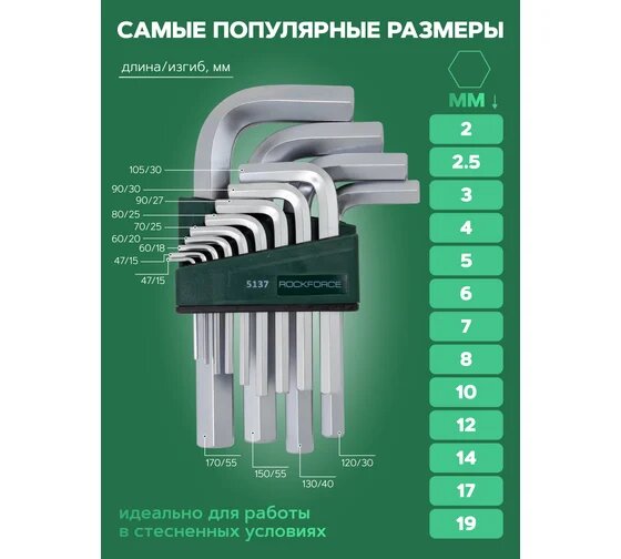 Отзывы на RF5137 ROCKFORCE Набор ключей шестигранных 2-19мм Г-образных 13 предметов ROCKFORCE
