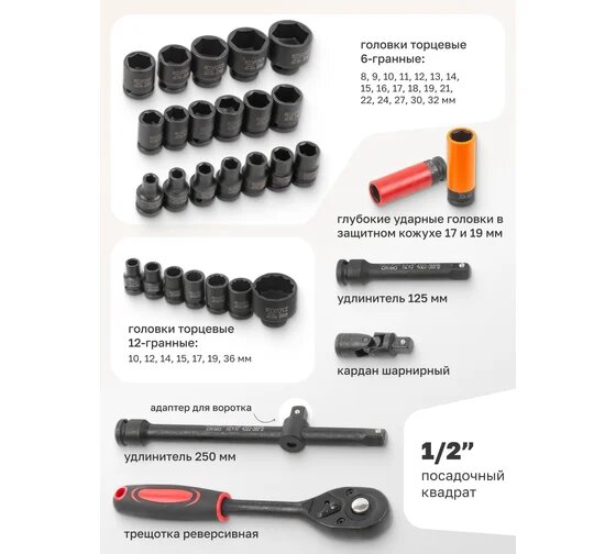 | Головки торцевые подробно | 12-ти гранные 1/4" длиной 25 мм: 4, 4.5, 5, 5.5, 6, 7, 8, 9, 10, 11, 12, 13, 14 мм; торцевые 12-ти гранные 1/4" длиной 50 мм: 6, 7, 8, 9, 10, 11, 12, 13 мм; головки-биты 1/4" длиной 35 мм: HEX 3, HEX 4, HEX 5, HEX 6, TORX 8, TORX 10, TORX 15, TORX 20, TORX 25, TORX 27, TORX 30, SL4, SL 5.5, SL6, РН1, РН2, PZ1, PZ2; 12-ти гранные 1/2" длиной 38 мм: 10, 11, 12, 13, 14, 15, 16, 17, 18, 19, 20, 21, 22, 24, 27, 30, 32 мм (усиленные 17, 19, 21 мм); 12-ти гранные 1/2" длиной 77 мм: 14, 15, 17, 19, 22 мм (усиленные 17, 19 мм); свечные 1/2": 16, 21 мм |