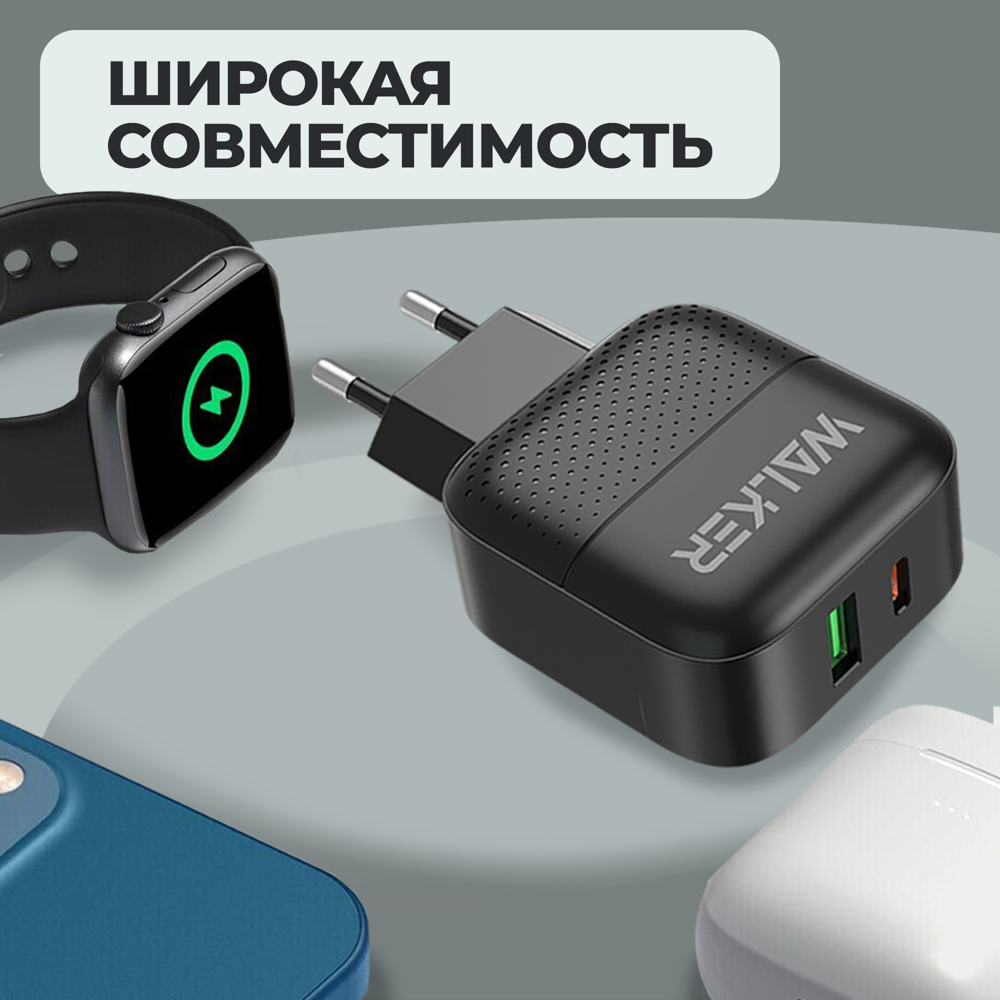 Зарядное устройство для телефона с быстрым зарядом, разъёмы USB и Type-C по 3.4A и мощностью по 18W, WALKER, WH-37, черное / сетевая зарядка, блок