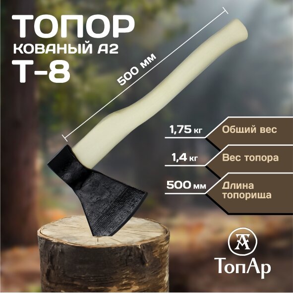 Топор хозяйственный кованый с деревянной рукояткой/ ТопАр 1,4 кг/Топорище 500мм из березы с биозащитным составом/с порошковым покрытием/A2