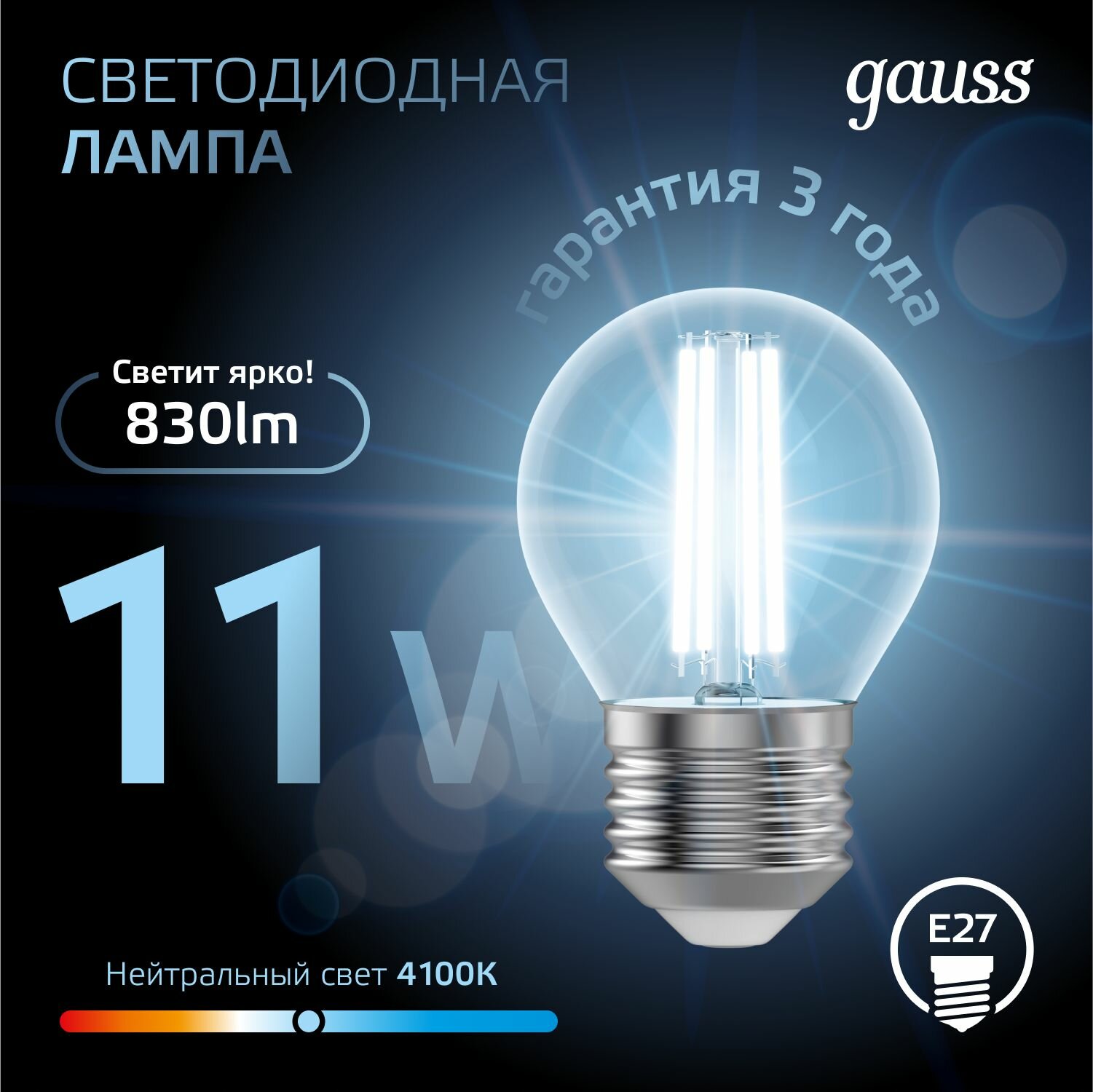 Лампа GAUSS филам. 11Вт цок.:E27 шар 220B 4100K св.свеч.бел.ней. G45 (1шт) (105802211)