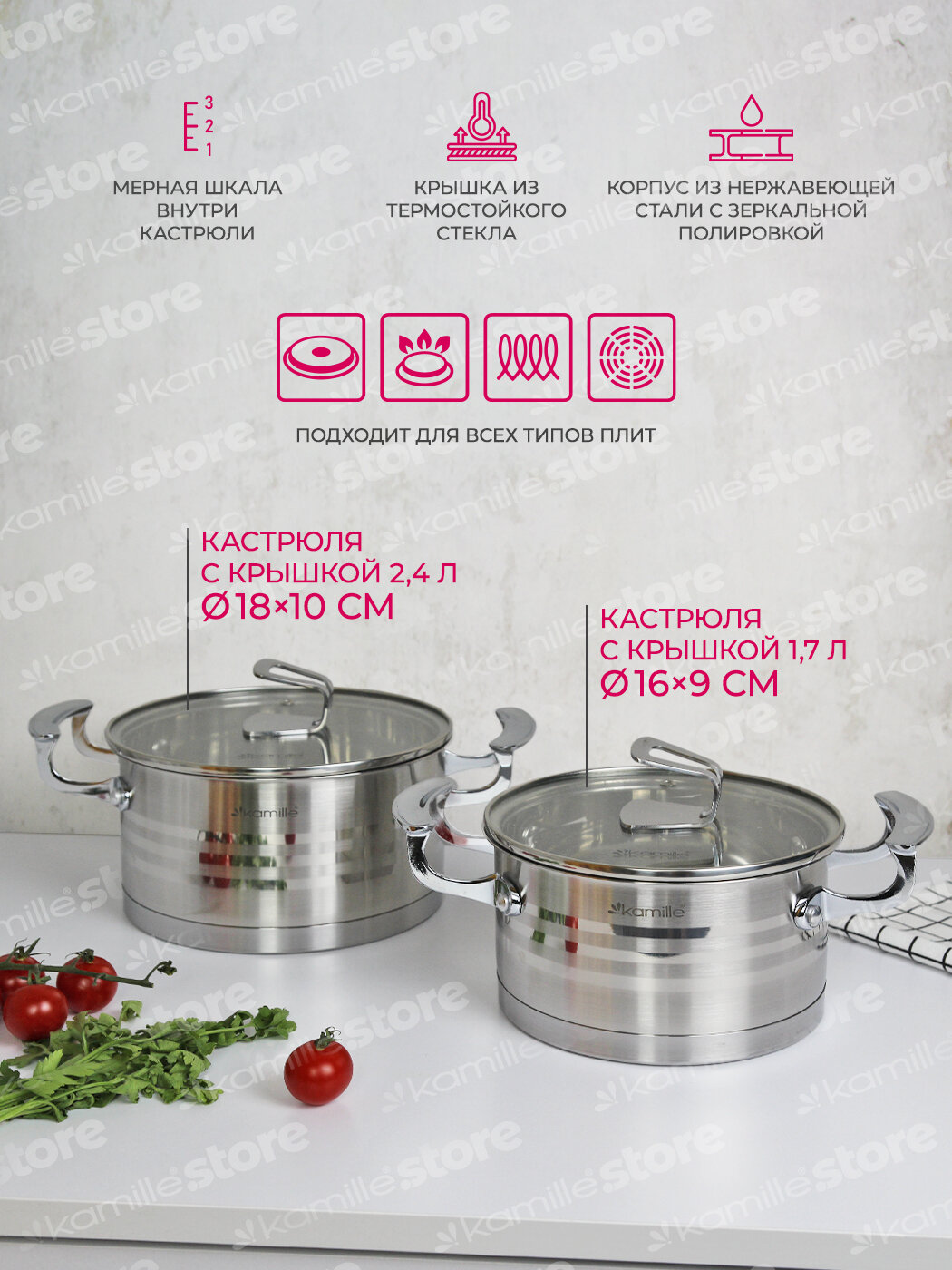 Набор кастрюль 4 предмета 1,7 л; 2,4 л. Kamille KM 5860 из нержавеющей стали (серебристый) информация: