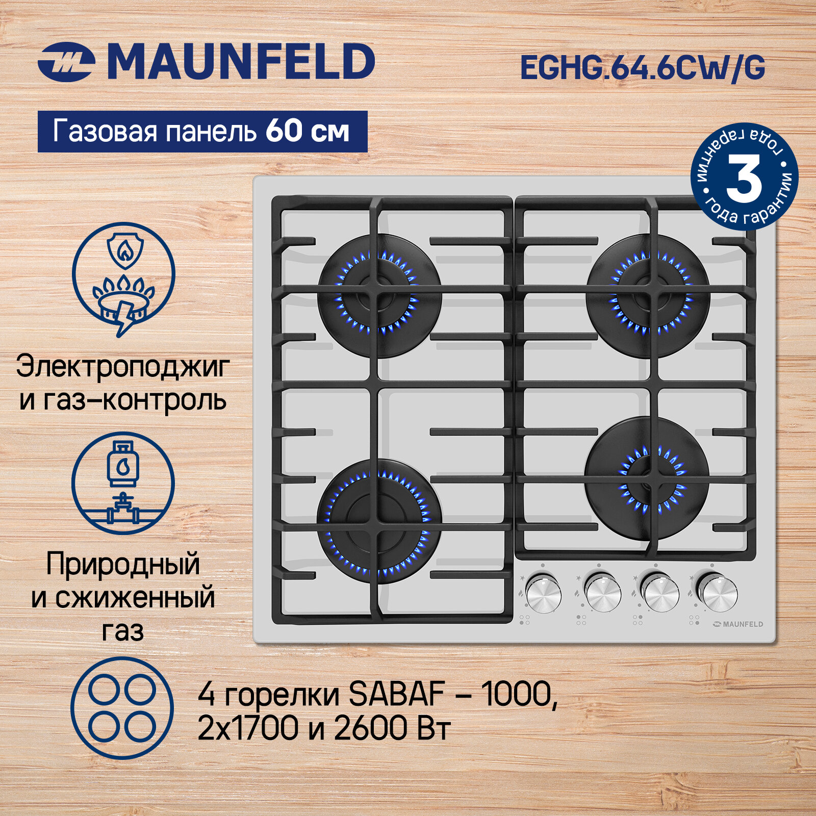 10 цен на Газовая варочная панель MAUNFELD EGHG.64.6CW/G, закаленное стекло, чугунные решетки, газ-контроль