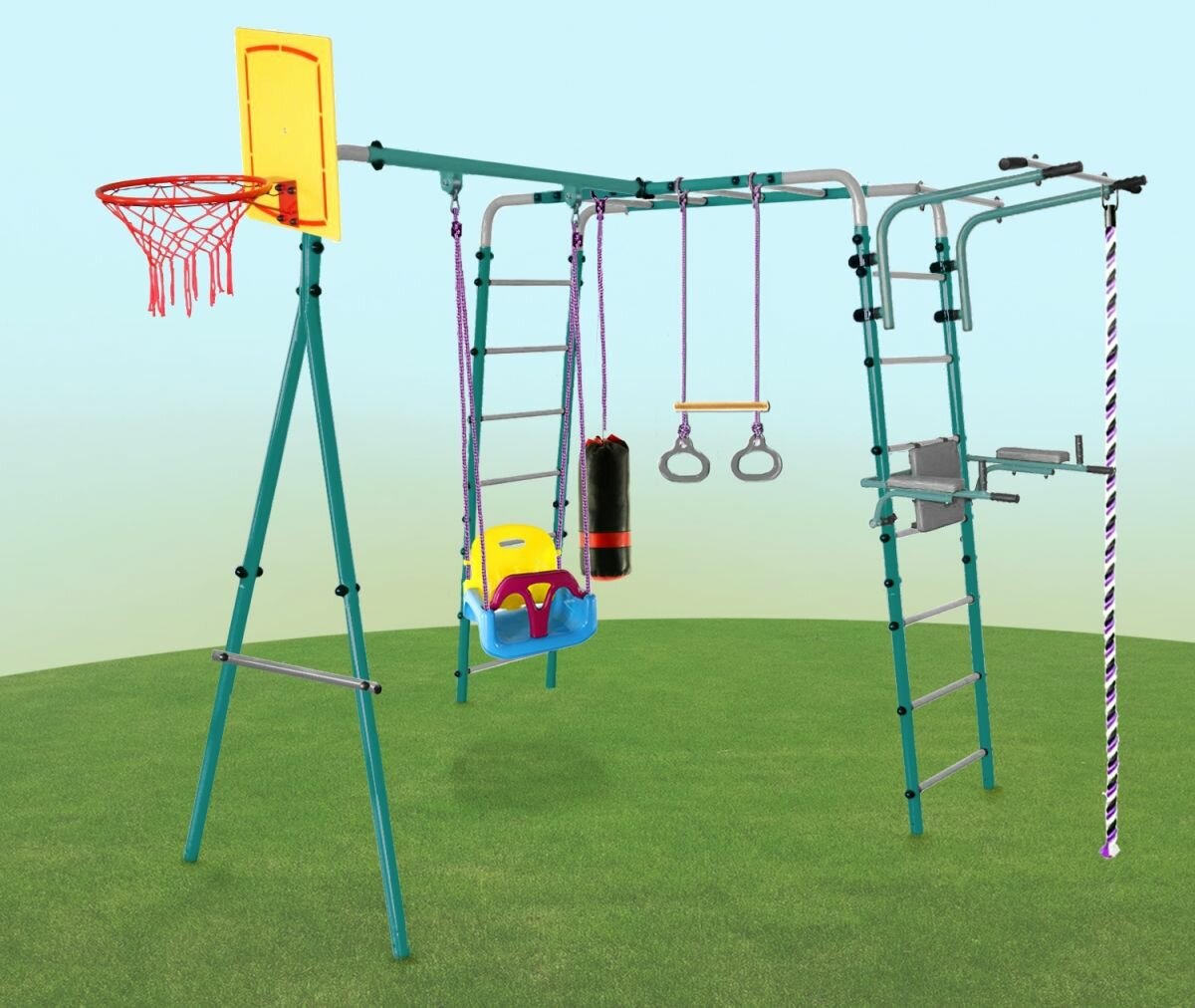 | Комплектация | спортивный комплекс с рукоходом, передвижной турник, кольца с перекладиной, подвесные качели - гнездо, пластиковые качели без спинки, подвесной гамак, канат |
