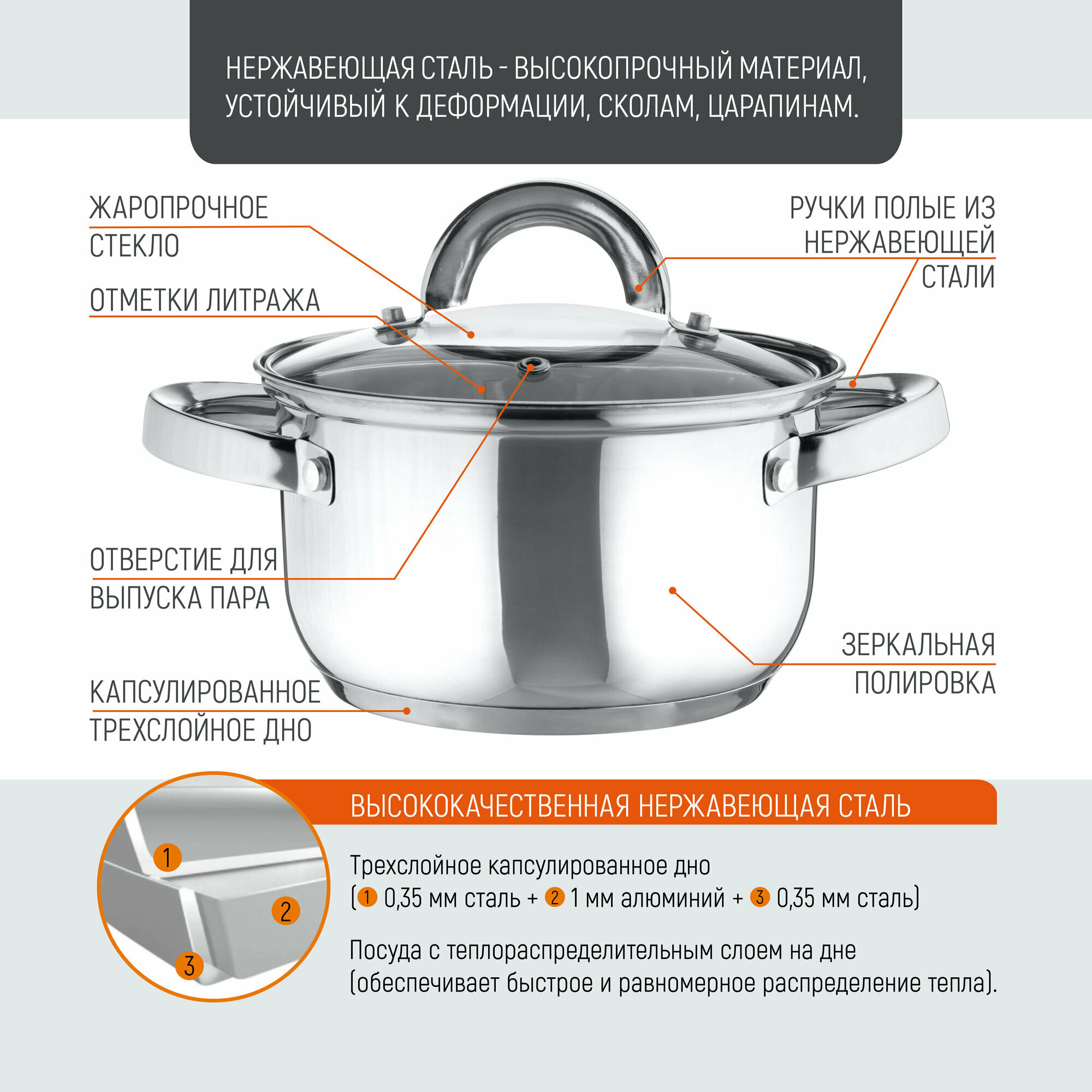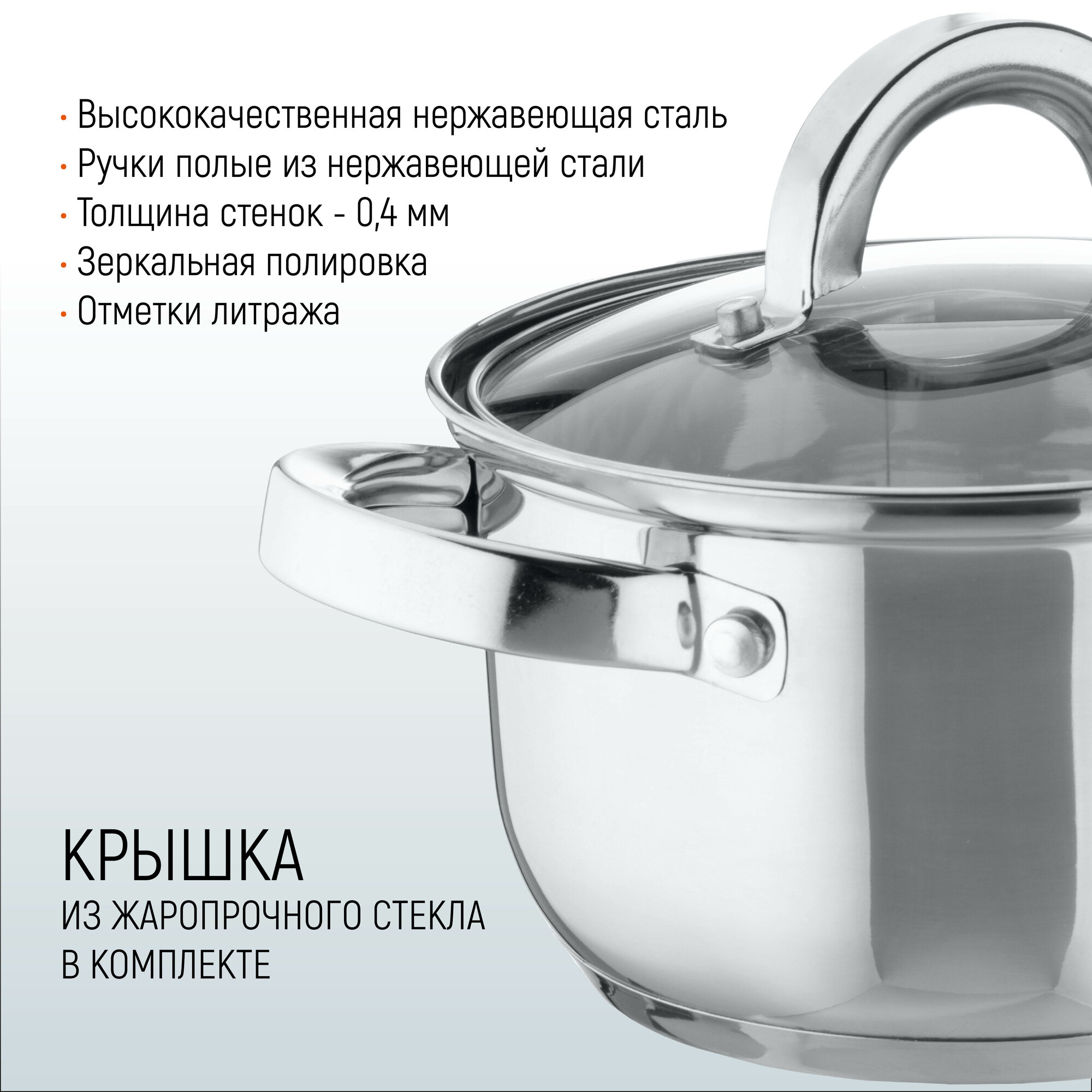 Кастрюля Mediano, объем 2,6 л, диа 18 см, из нерж стали с крышкой, ручки из нерж стали, капсулир дно информация: