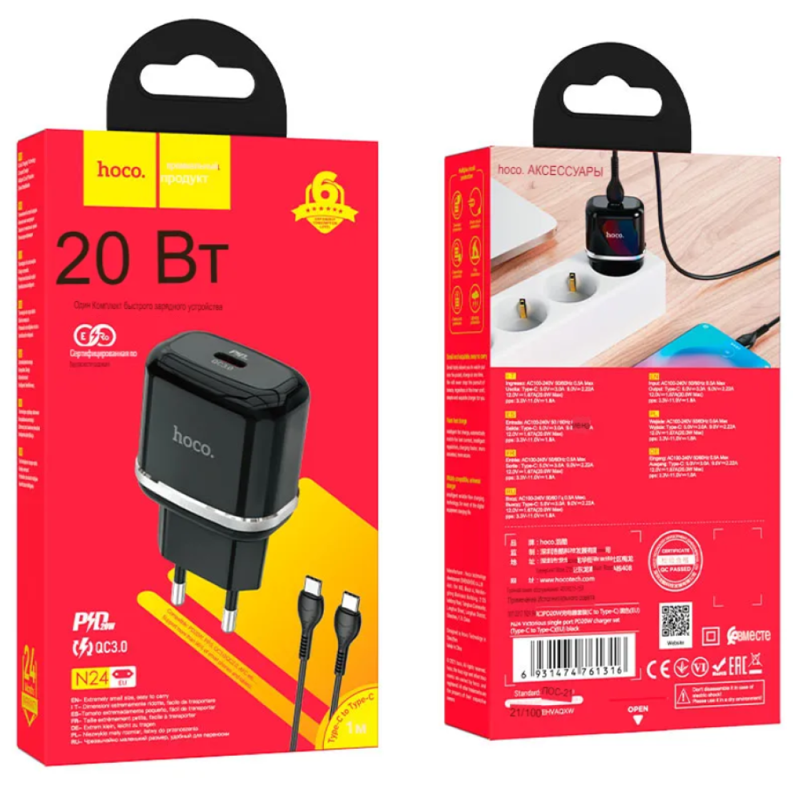Отзывы на Сетевое зарядное устройство, 1 PD 20W, 3.0 QC (N24), HOCO, Type-C to Type-C, черный
