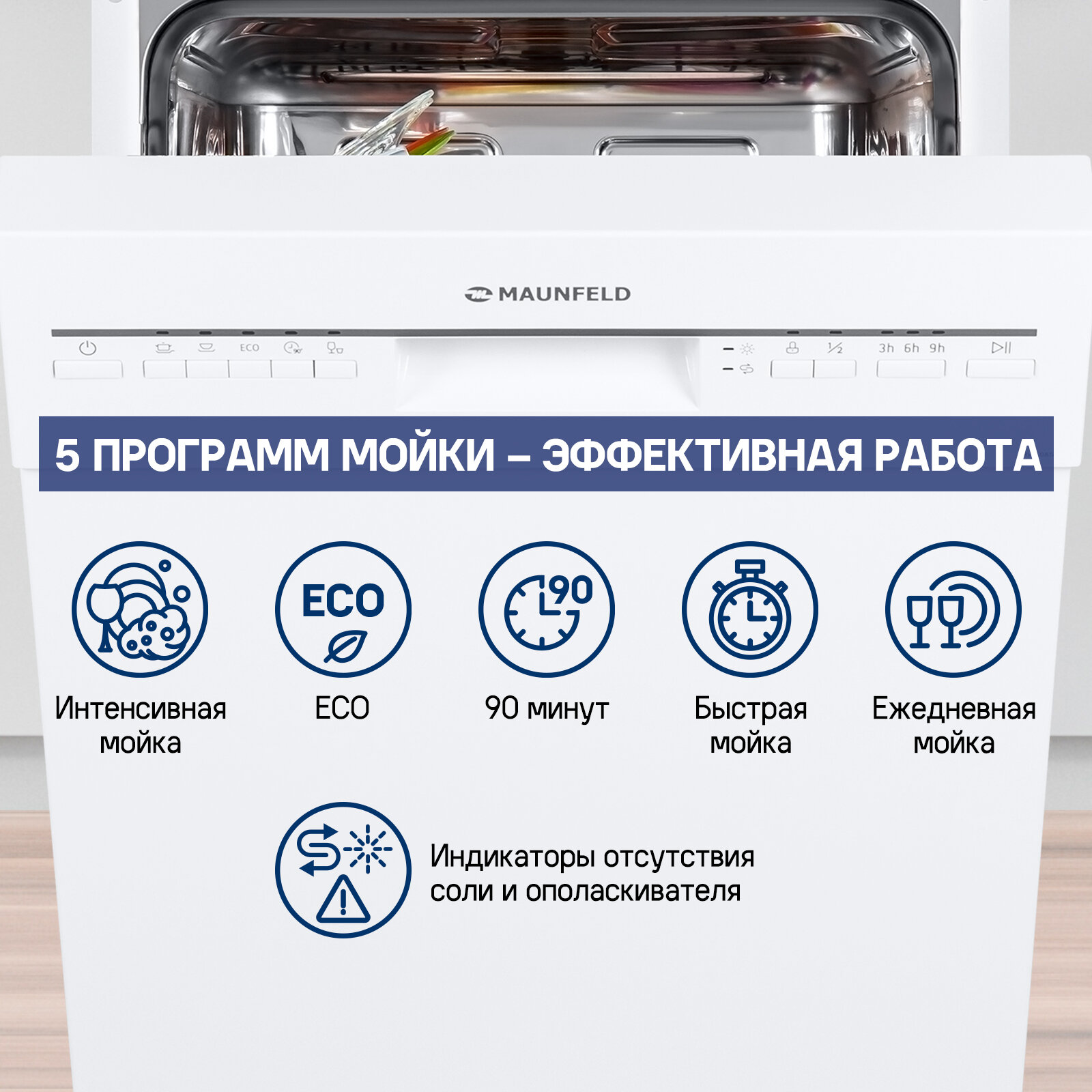 Посудомоечная машина MAUNFELD MWF08S отдельностоящая узкая 45 см, 9 комплектов, 5 программ, 2 корзины, половинная загрузка, средство 3в1, дозагрузка посуды информация: