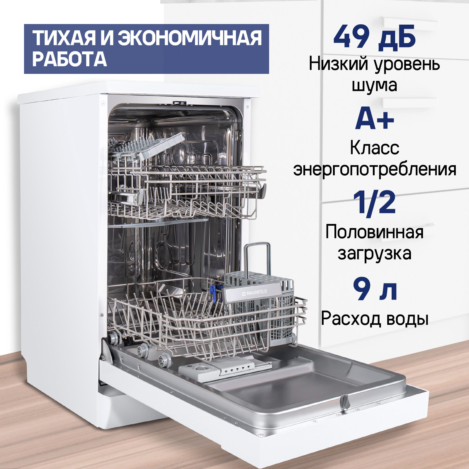 10 цен на Посудомоечная машина MAUNFELD MWF08S отдельностоящая узкая 45 см, 9 комплектов, 5 программ, 2 корзины, половинная загрузка, средство 3в1, дозагрузка посуды