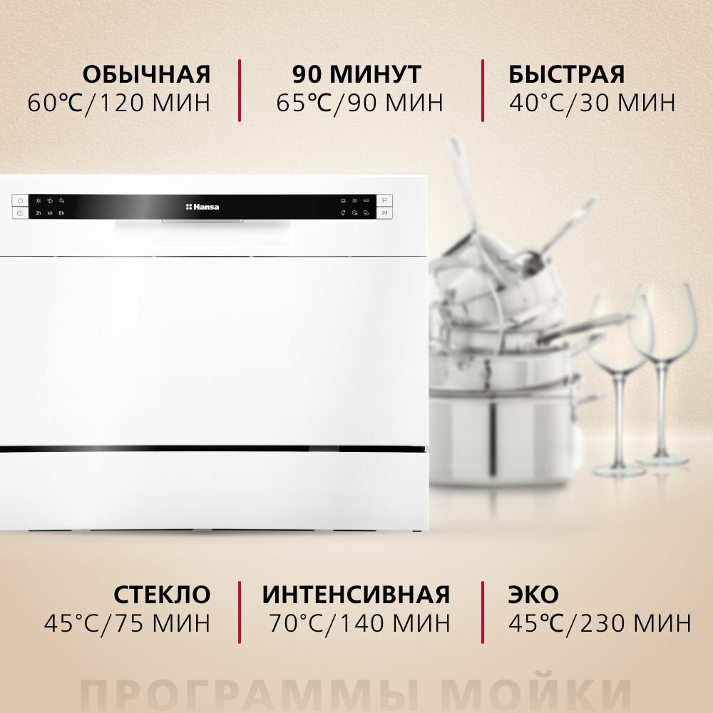 Посудомоечная машина настольная Hansa ZWM536WH, 55 см, компактная, 6 программ, 1 корзина режим быстрой мойки и отсрочки старта, отдельностоящая информация: