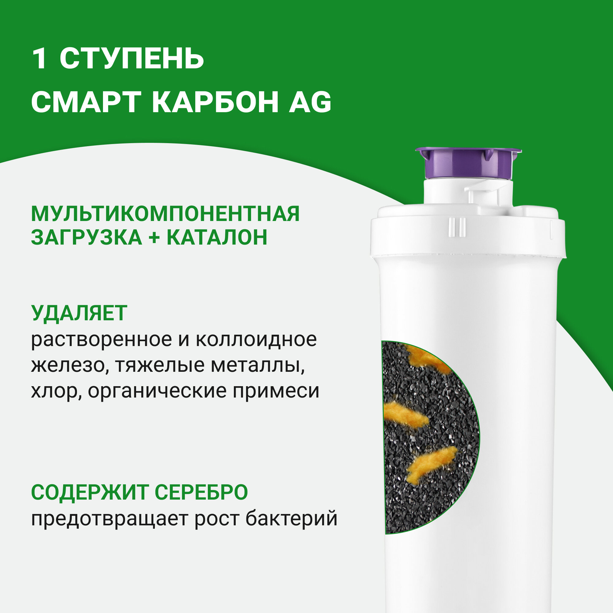 Сменный картридж для воды Гейзер Карбон AG, совместим с фильтрами "Смарт" и "Оптима", удаляет растворенное и коллоидное железо, тяжелые металлы и органические примеси, 30639 информация: