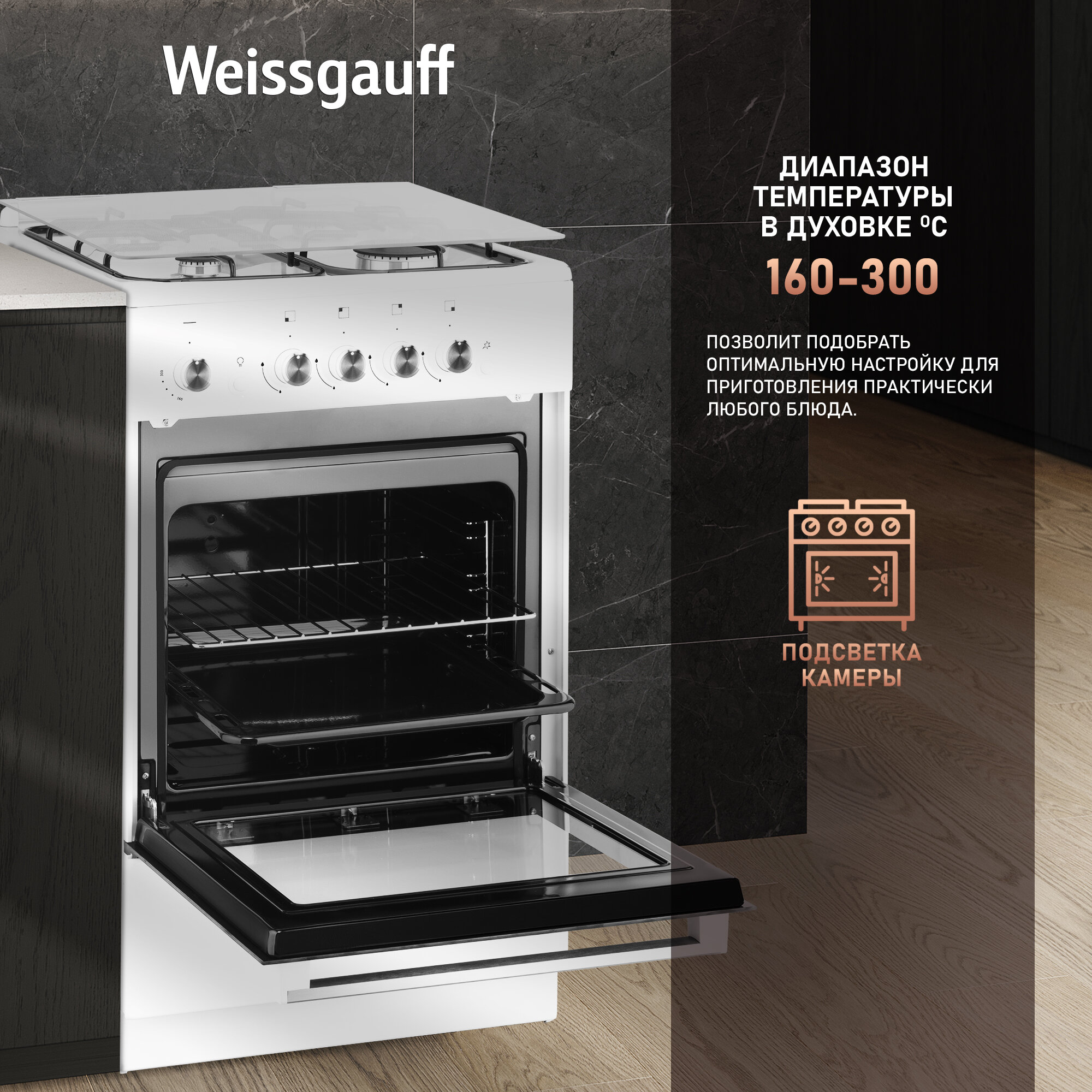 10 цен на Газовая плита Weissgauff WGS G4G02 WS 3 года гарантии, Объем 60 литров, Электроподжиг, Комплект для подключения сжиженного газа