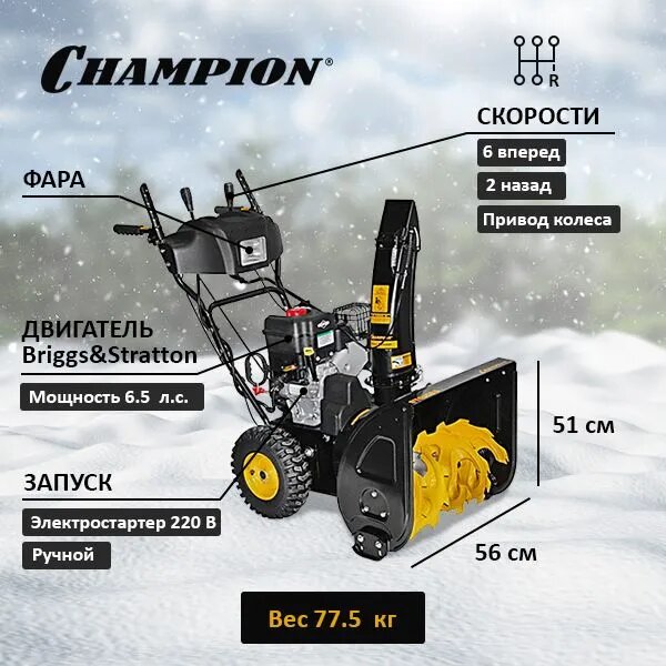 Снегоуборщик CHAMPION ST656BS (208сс B&S900 7,5лс 56см 6/2 эл.старт фара LED 77,5кг)