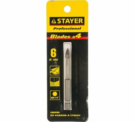 10 цен на STAYER Сверло "PROFI" по керамике и стеклу, с четырьмя режущими лезвиями, d=6мм 2985-06_z*01