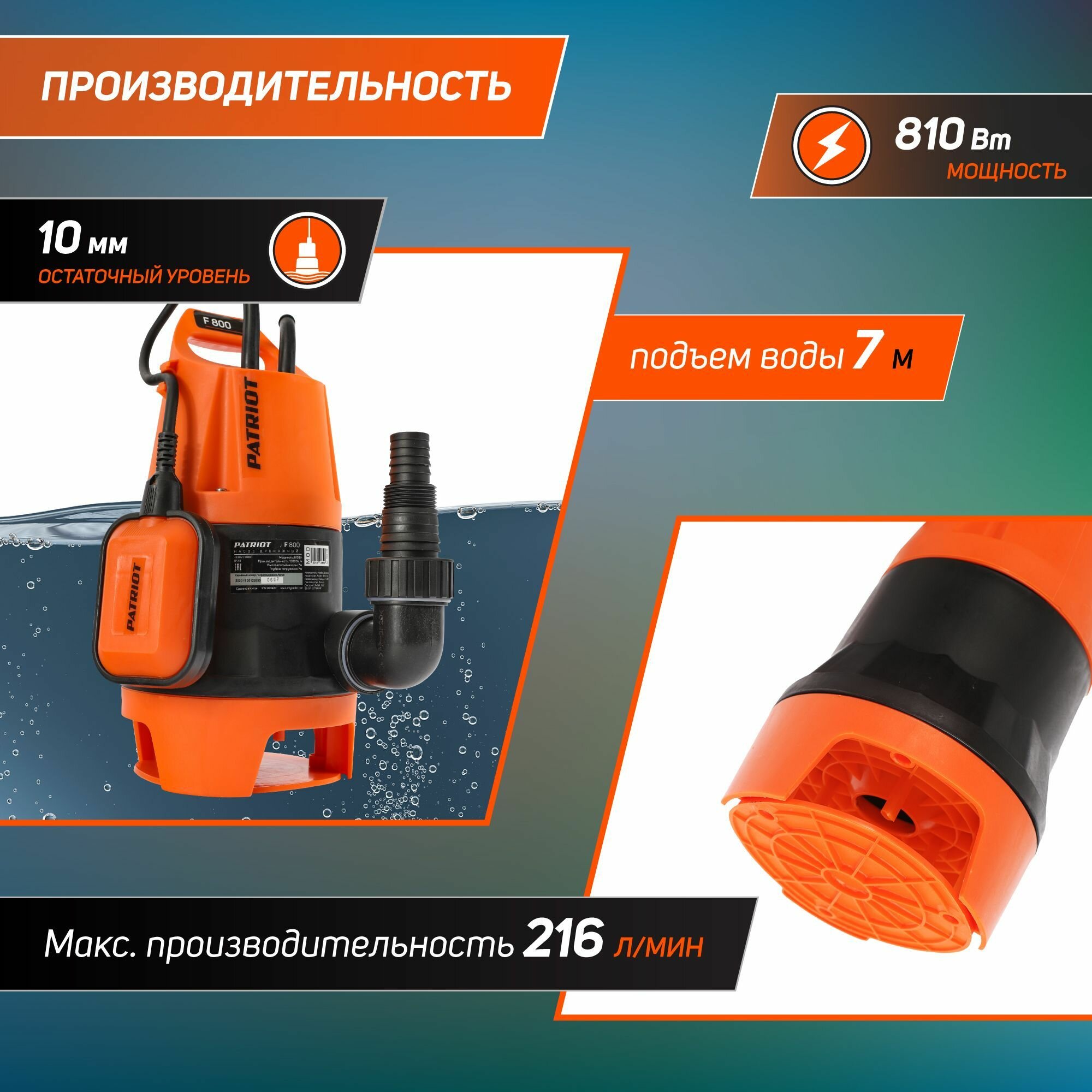 Насос дренажный PATRIOT 315302467 F 800 13000 л/мин, 810 Вт, оранжевый/черный информация: