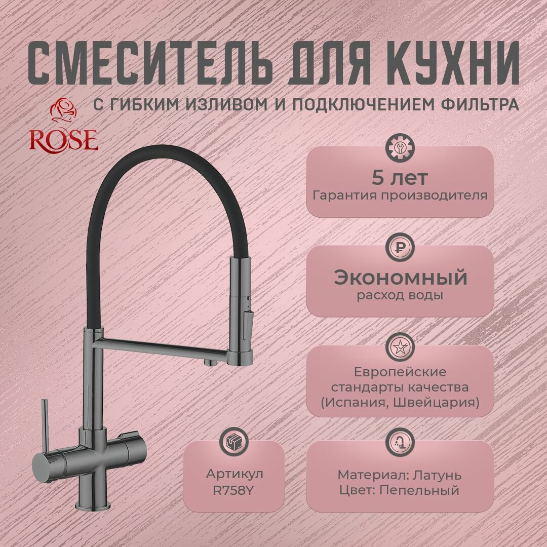Смеситель для кухни с гибким изливом и поключением фильтра питьевой воды Rose R758Y, пепельный информация: