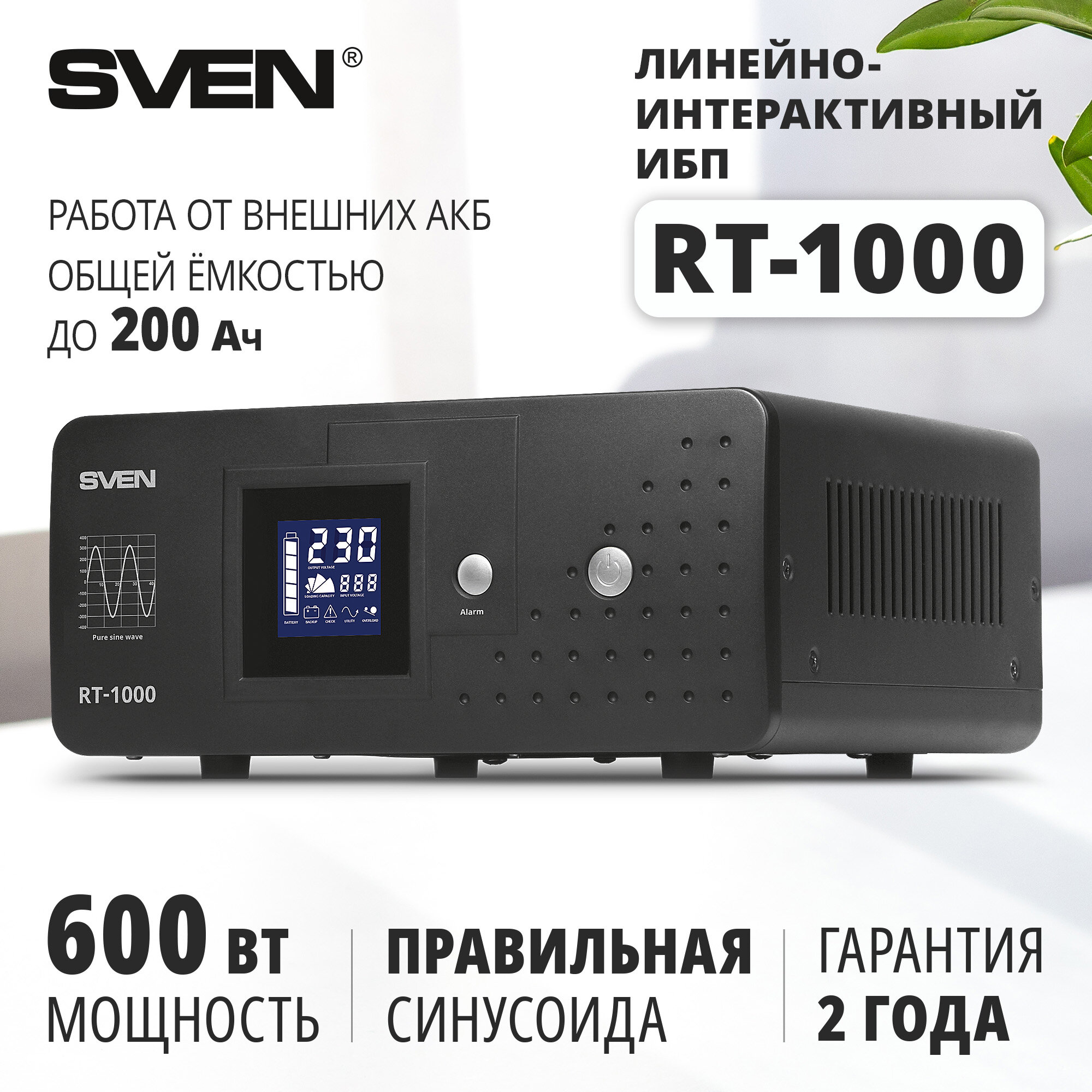 Sven ИБП SVEN RT-1000, линейно-интерактивный непрерывного действия с длительным временем резервирования, автоматический стабилизатор напряжения, 600Вт, 1000Ва, 2 евророзетки, аккумуляторные батареи в комплект не входят, 300мм x 270мм x 140мм, 9.9 кг/ UPS