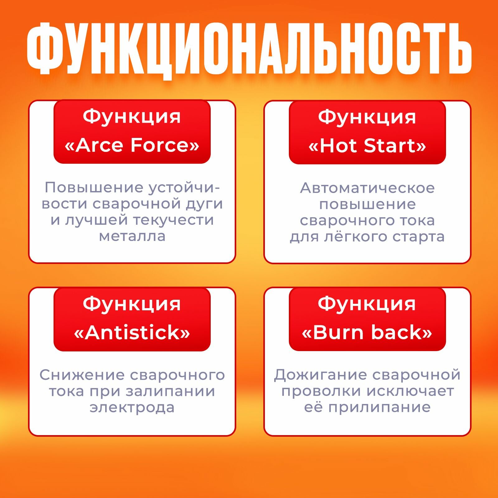 | Дополнительные функции | антиприлипание / горячий старт / форсаж дуги |