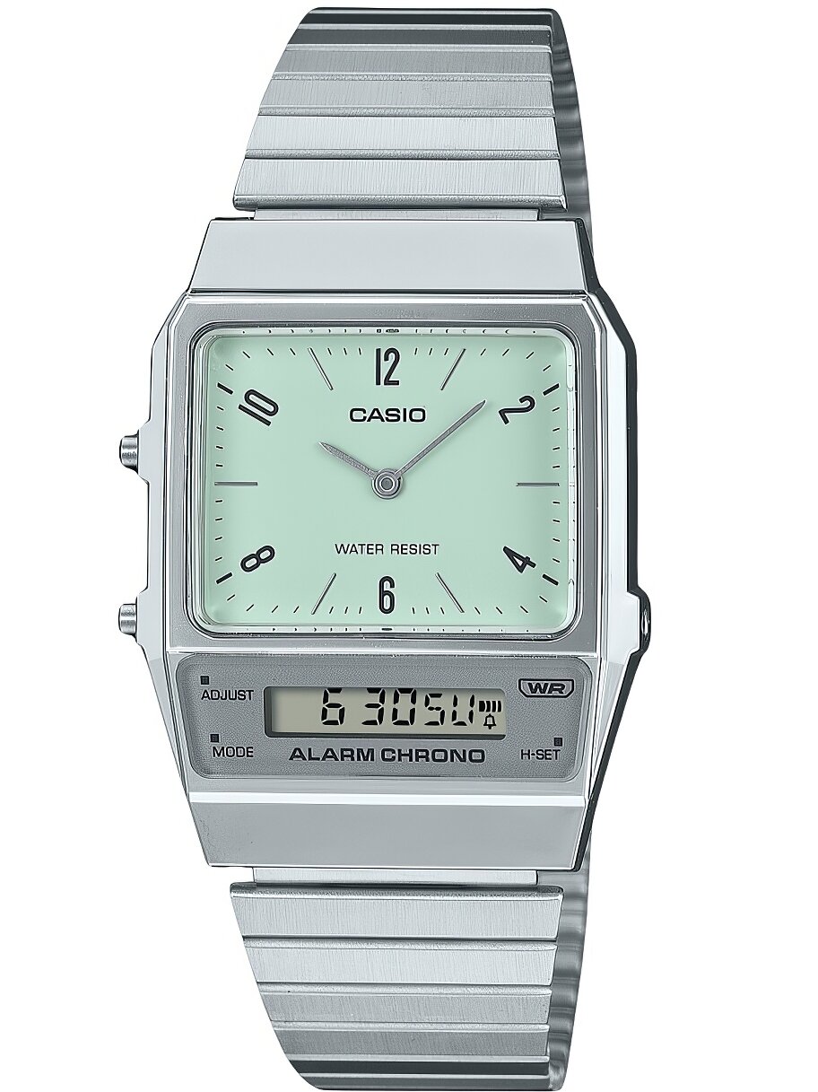 AQ-800E-3A Casio наручные часы кварцевые WR30 (3 атм) мужские, женские серебряный, зеленый секундомер будильник отображение числа, второй часовой пояс, отображение дня недели, отображение месяца акриловое стекло информация: