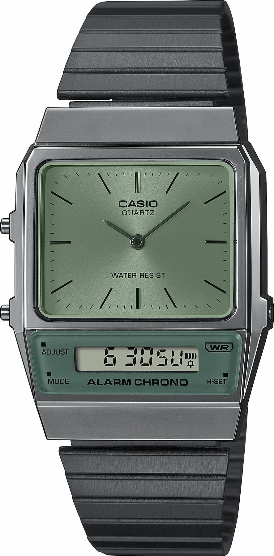 AQ-800E-3A Casio наручные часы кварцевые WR30 (3 атм) мужские, женские серебряный, зеленый секундомер будильник отображение числа, второй часовой пояс, отображение дня недели, отображение месяца акриловое стекло 7 799 ₽