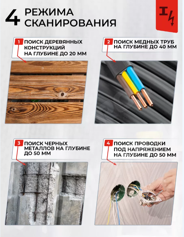 | Глубина обнаружения деревянных конструкций | 38 мм |