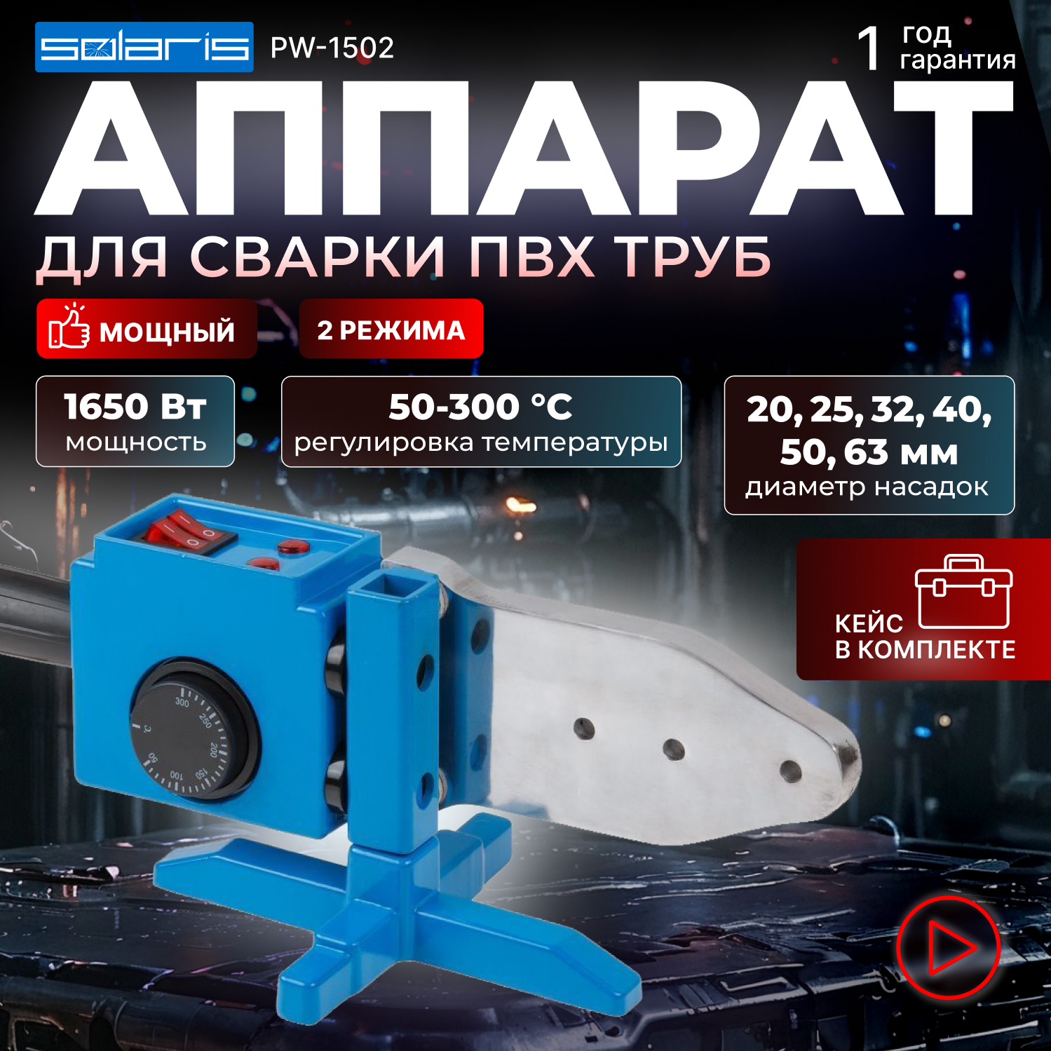 Паяльник для полипропиленовых труб и насадки, Аппарат для сварки пластиковых труб, Solaris PW-1502 (1500 Вт; 6 насадок: 20 - 63 мм; 2 режима нагрева; доп. аксессуары) (SOLARIS) (PW-1502) 4 540 ₽