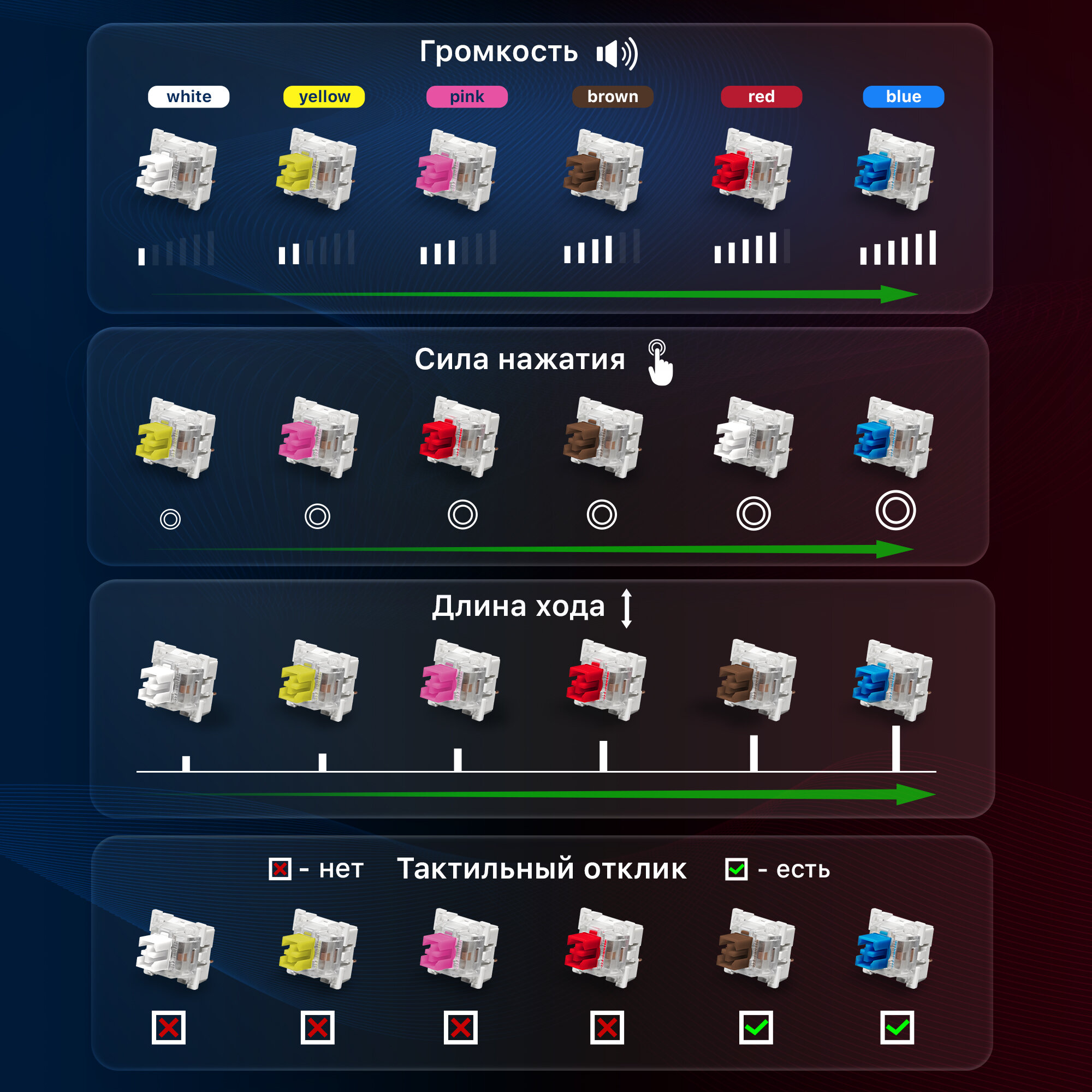 | Дополнительная информация | ; радужная подсветка, 9 режимов, 3-уровневая регулируемая яркость, возможность выключения подсветки; повышенная износостойкость; аппаратная блокировка клавиши WIN во время игры, распознает одновременное нажатие 26 клавиш, комбинации клавиш ""Fn+Ins"", горячие клавиши для быстрого доступа к офисным, мультимедийным и интернет приложениям; звонкий звук/щелчок переключателей; технология Double injection |