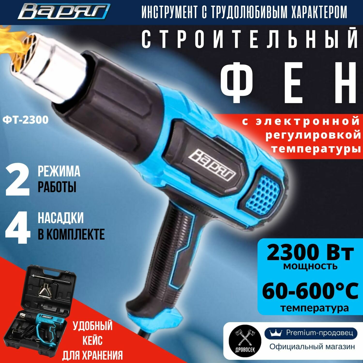 Фен строительный с регулировкой температуры варяг ФТ-2300, термофен технический (2 режима, 2300Вт,300-500 л мин, 60-600 градусов, 4 сопла)