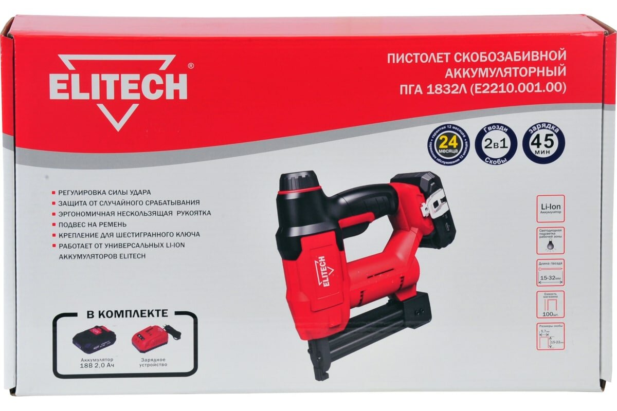 Степлер аккумуляторный Elitech ПГА 1832Л ( E2210.001.01) скобы тип 90: 15-25 мм гвозди тип 300 / 500