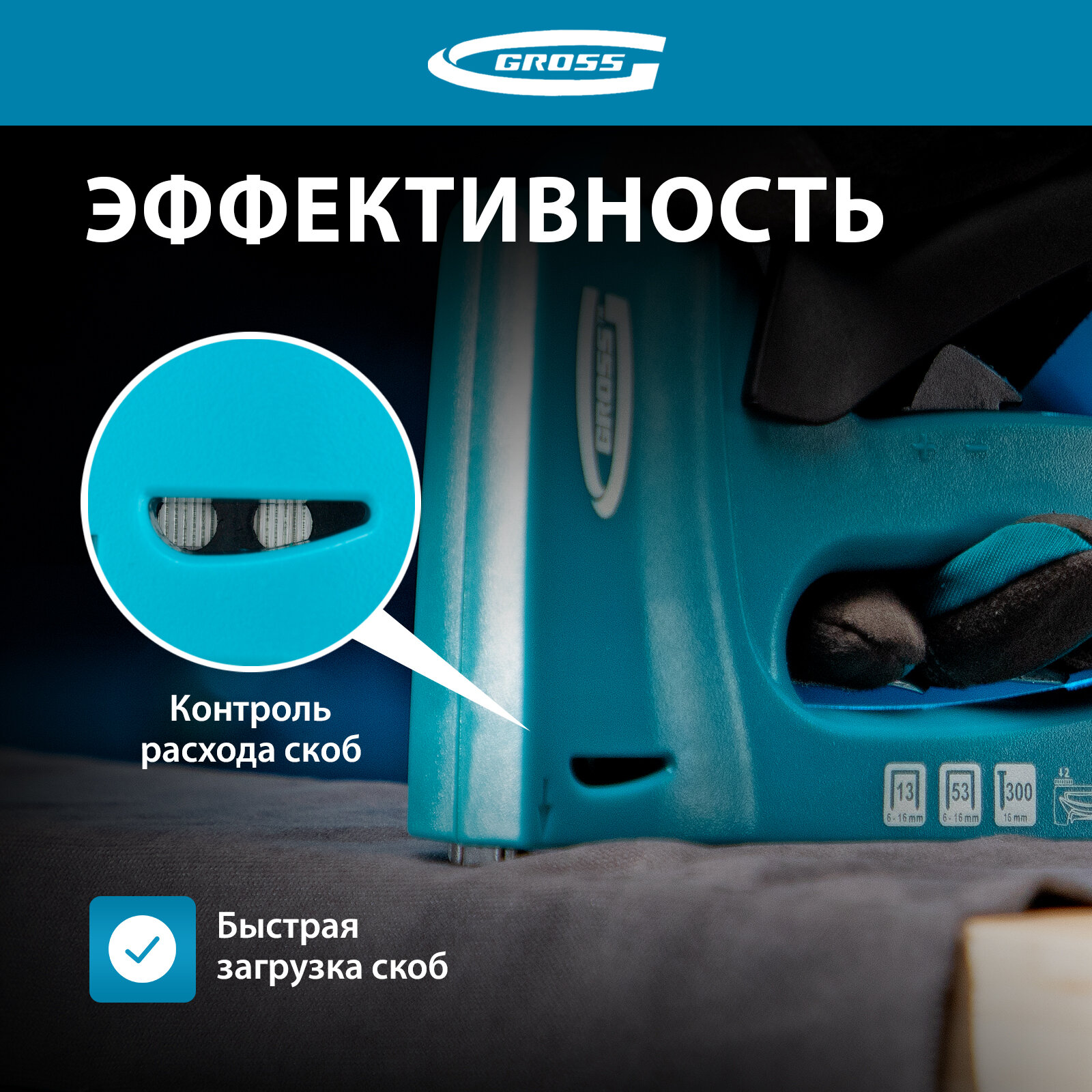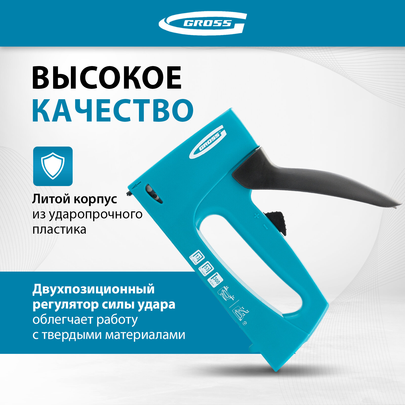 Степлер мебельный, пластиковый корпус, регулировка удара, тип скобы: 13, 53, 300, 6-16 мм Gross