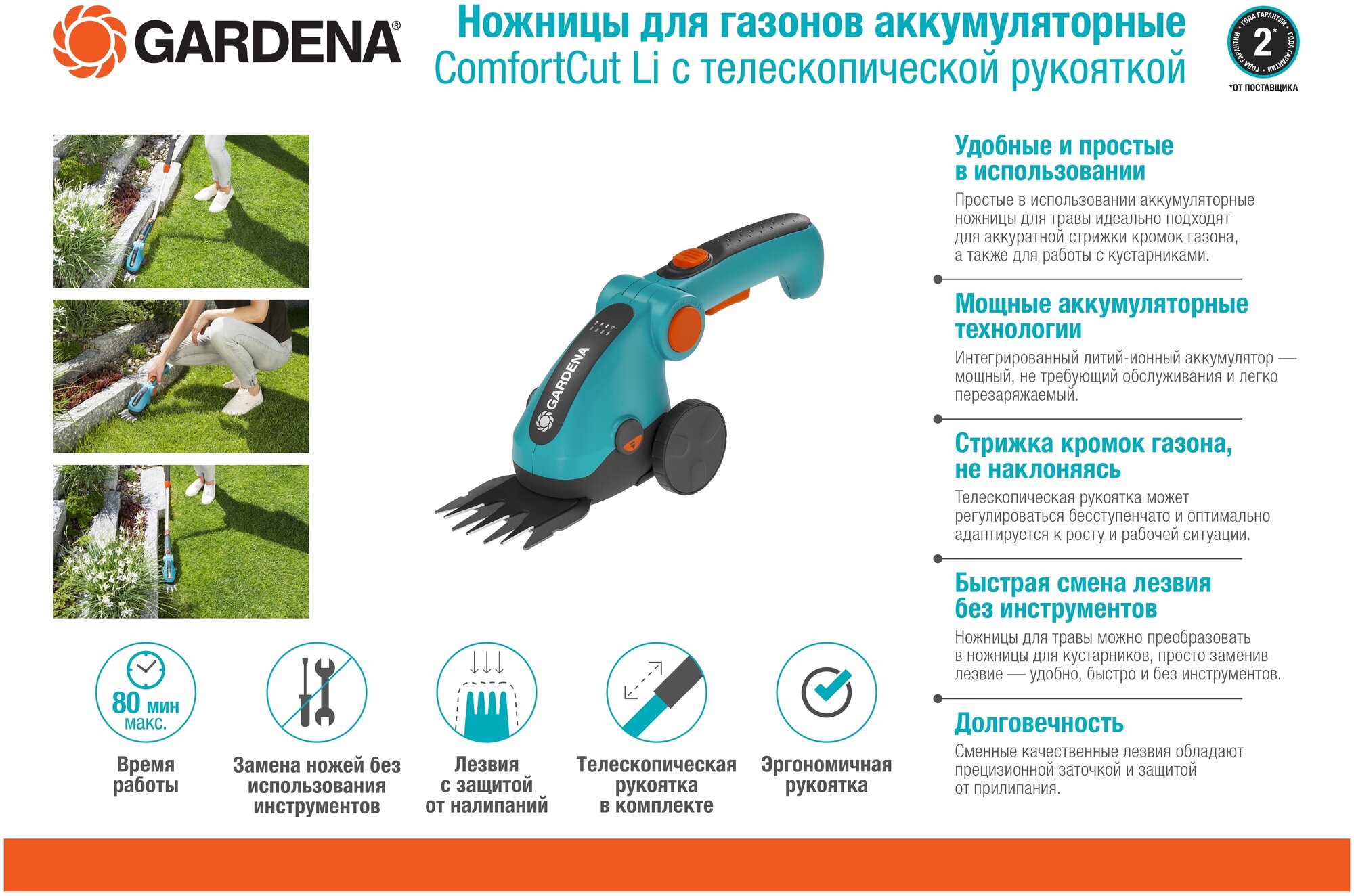Ножницы для травы аккумуляторные Gardena ComfortCut Li с телескопической ручкой, ширина кошения 8 см, встроенная АКБ 3 Ач + ЗУ информация: