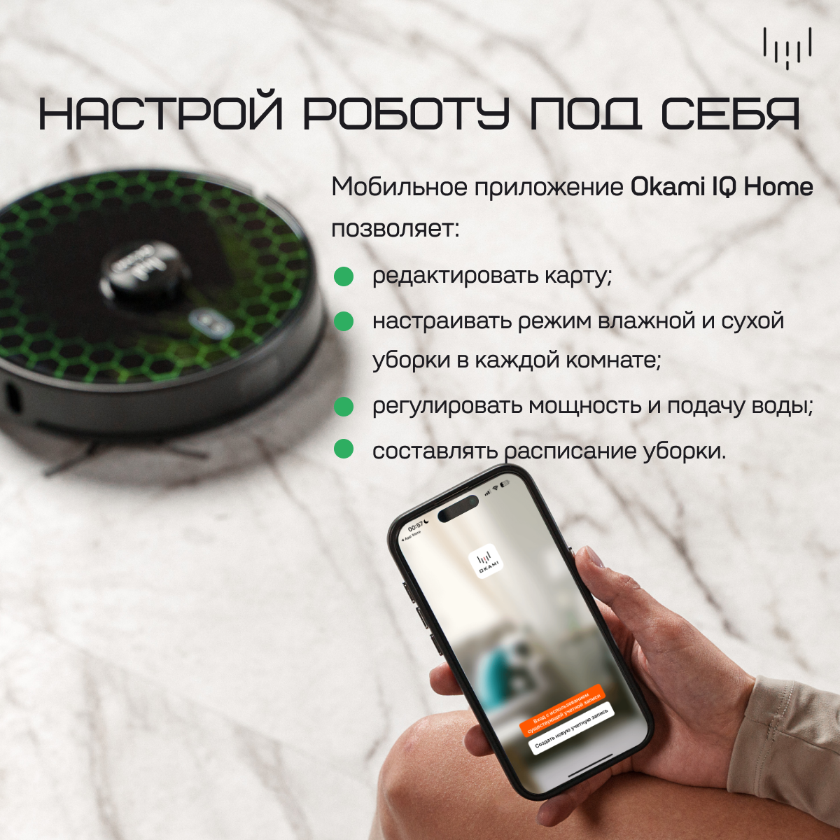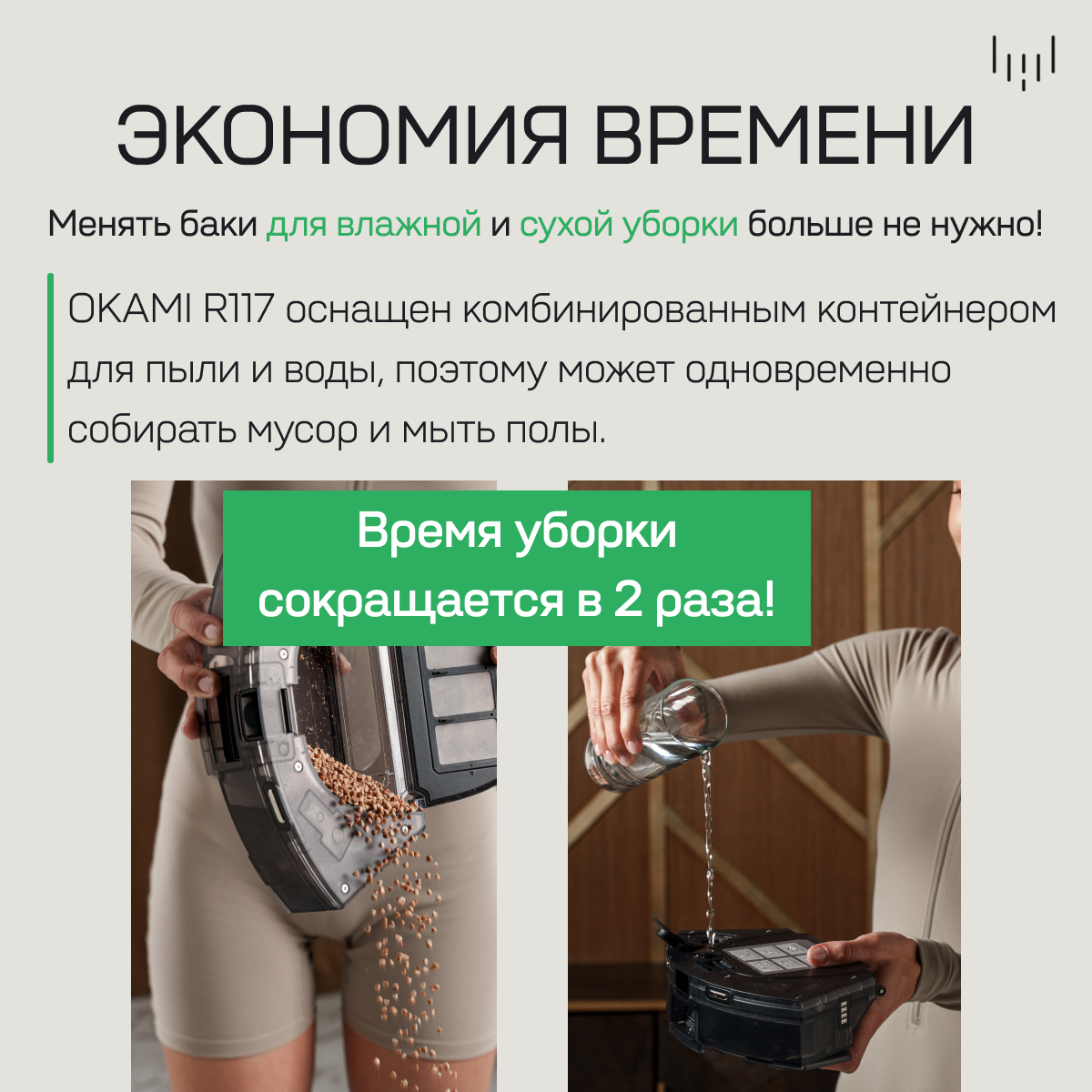 OKAMI Робот-пылесос R117: Оками 6500 Па, подвижная турбощетка, автоматическая уборка с влажной протиркой и увеличение мощности на коврах информация: