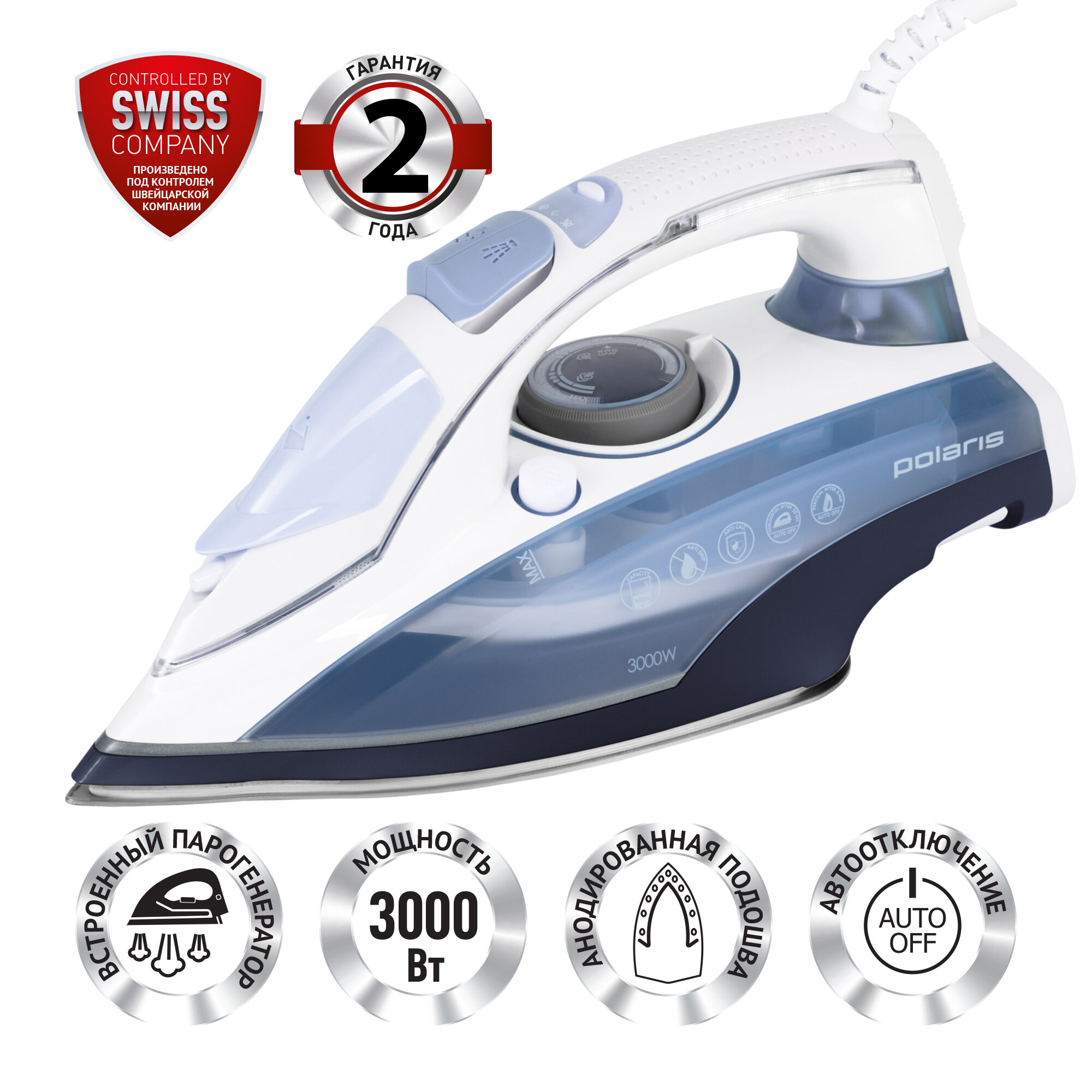 10 цен на Паровой утюг Polaris PIR 3074 SG AA 3m, встроенный парогенератор, мощность 3000 вт, белый/голубой